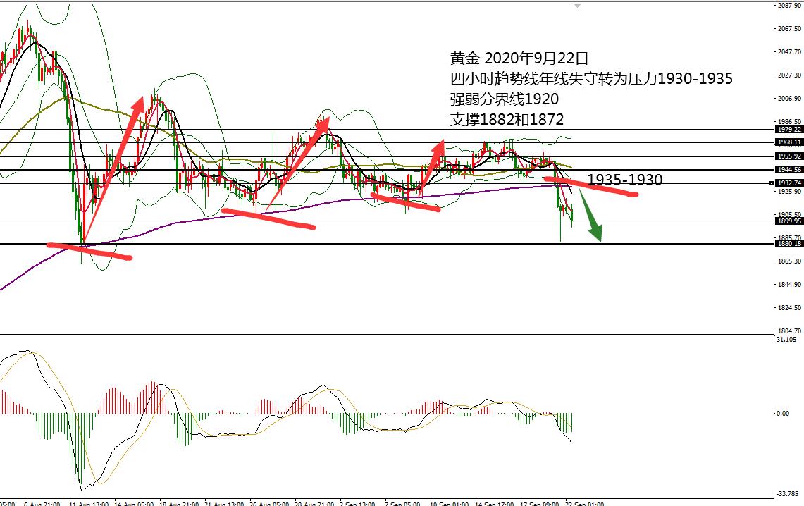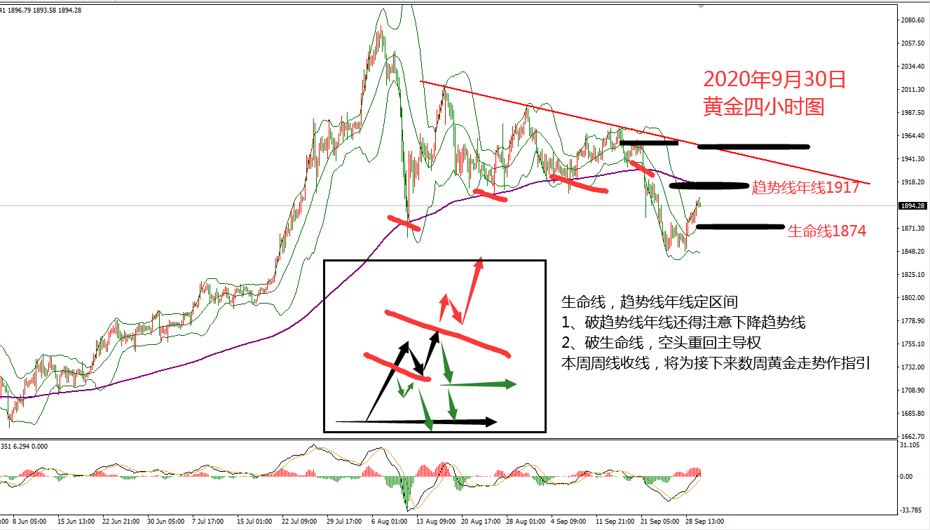 何小冰:黄金四小时趋势线和生命线,首触需空 09.22 黄金周一开盘反弹确定阻力1955.5,持续横盘修正直至欧盘开始承压下挫破低扩大跌幅至1928,美盘前小幅反弹1935继续承压破低下挫,晚间22点过后扩大跌幅至1882,尾盘探底回升反弹,截至今日早盘反弹测试1920关口。 今日亚盘反弹确定阻力承压,午后再度承压破开盘低点下探至1898.5区域,触及快速反弹测试1909.5后承压回落下探至1894.5。 昨日开始价格和方向变动的时间越来越短,速度越来越快,这一点跟往年国庆前后的行情比较相似的, 价格开始明显的快和乱,然后到国庆周的时候出现明显的大扫荡或者大反转的行情。 去年已经罗列过往国庆