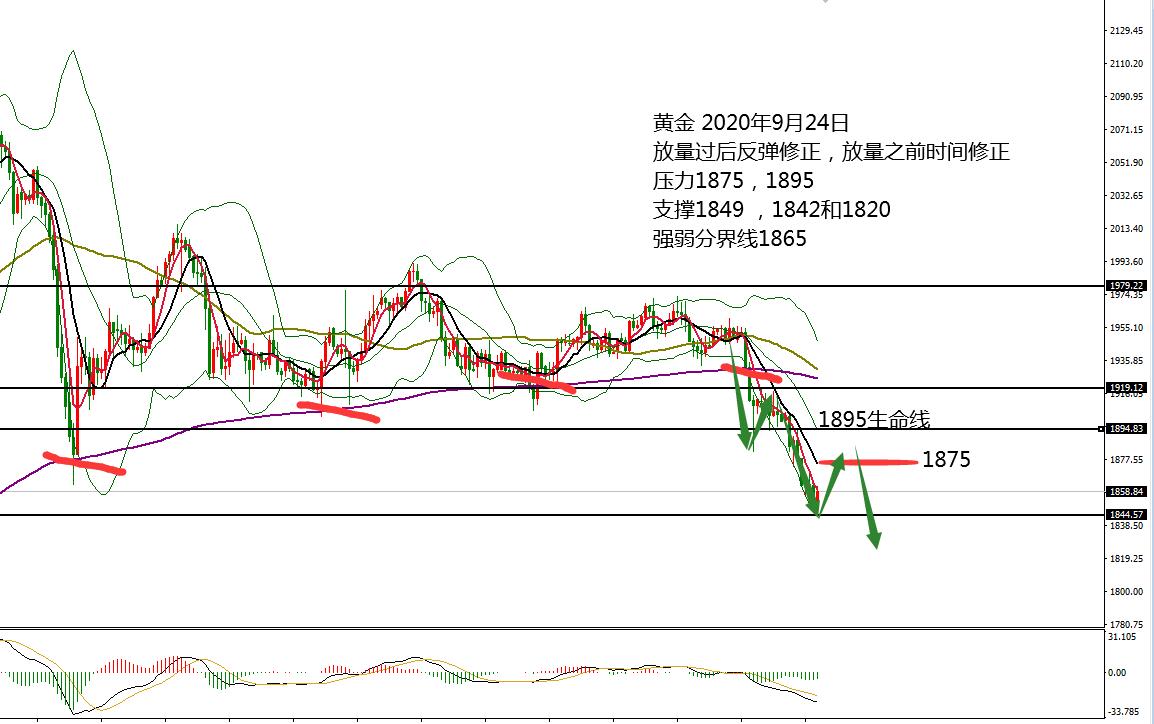 何小冰:黄金非农前破低放量,未破低修正 09.28 黄金上周整一周呈现震荡式回落,周一大阴回撤,周二修正,周三破低扩大跌幅,周四周五进行修正。 在这过程中,破低延续放量,未破低横盘修正,对应周一和周三破低放量,周二周四周五未破低横盘修正。尾盘低位横盘修正结束当周的行情。 而在周线上,2075大阴回撤过后,进入五周的横盘修正,但在上周出现的承压回落收取大阴线也是改变了原来的横盘修正,下方触及生命线分界位置。 接下来面临着两种选择: 一是与5月底6月初相似的行情 ,大阴过后大阳收复失地,重新站上均线上方,以5日均线作为支撑,10日均线作为防守继续高歌猛进; 二是延续走低,破生命线扩大跌幅寻找更低
