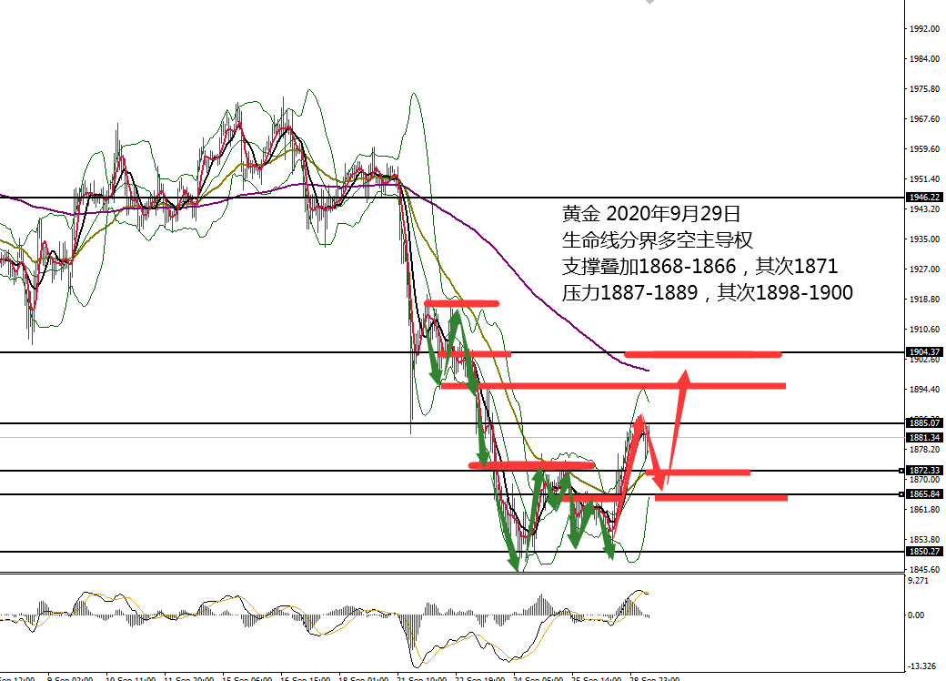 何小冰:黄金生命线低多看涨1898,时间空间点结合 09.29 黄金亚盘承压1866回落下探,欧盘反复测试1863压制走低下探破低至1848.5,晚间18点前后开始形成探底回升拉升走强,震荡式向上走高攀升至1877,晚间22点回踩1865后继续高歌猛进破高加速攀升至1883,今日早盘延续刷新高点1887。 起跌点以及高点的支撑阻力转换成为接下来的重点 ,上周四周五的高点压力被突破,下一个便是周三的高点1905,以四小时生命线1866-1868区域作为分界。 周线来到生命线位置,面临着两种选择:一种是重复5月底6月初的大阴过后大阳收复,一种是破生命线扩大回调区间。 这两种无论如何选择都将对未来