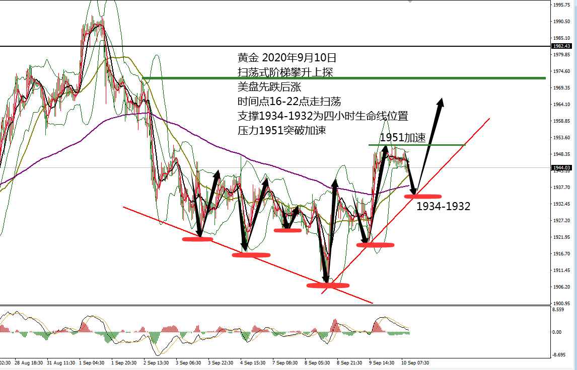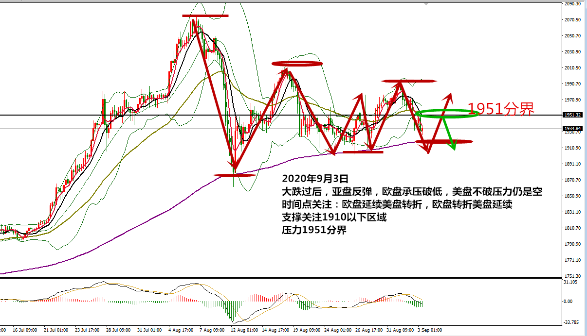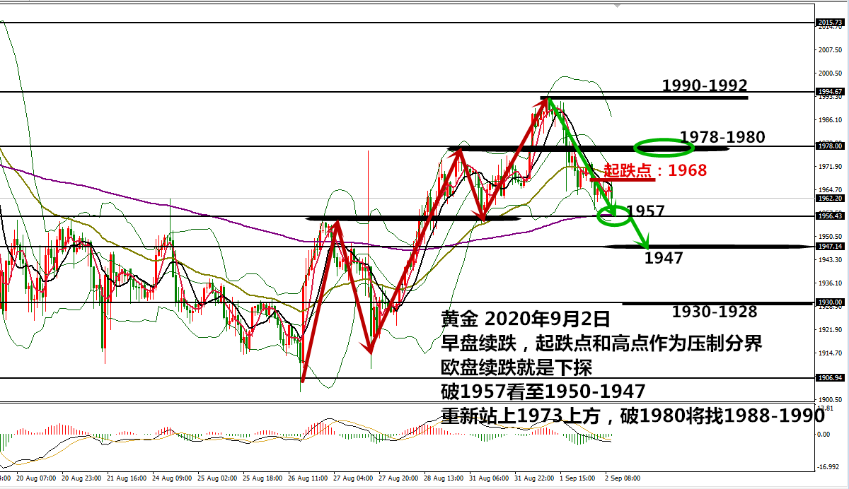 何小冰:黄金年线支撑将探底回升,空间逾80美元09.03 黄金周三开盘承压1973破低下探1959,午后承压1957.5再破低1956,欧盘再度确定1972的压力,美盘再度破低下探1953.5,小非农数据公布后短线拉升16美元至1969区域,美盘过后开始放量下跌,最终跌至1932附近,较日内高点,跌幅临近40美元。 主因仍是在于欧元遭遇抛售助推美元走高,从而打压黄金和非美货币走低,黄金在昨晚美盘时段延续性走低下探 。现在市场更多关注在周五的非农就业数据报告,希望能够获取更多美国现状的信息,美股三大股指走强,反而令市场的担忧悲观情绪加重。 黄金本周节奏偏向于扫荡性,有明显的转折变化的时间点两个