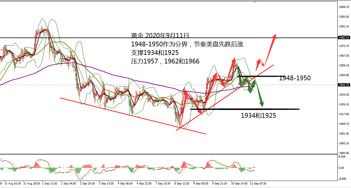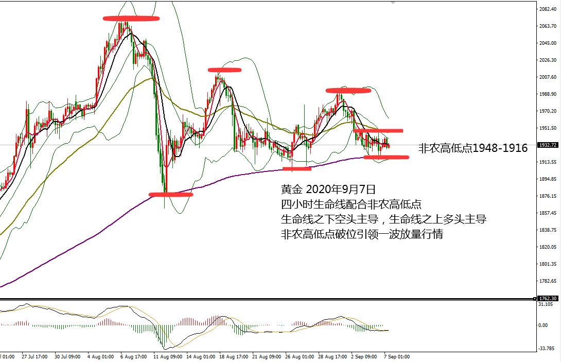 何小冰:黄金生命线配合非农高低点,破位放量09.07 黄金在上周五非农数据公布之前,依托1930向上攀升走高,数据公布后短线拉升冲刺1948区域,随后急转向下下探至1925,反弹确定1934的阻力后继续扩大跌幅下探至1916,不过在尾盘凌晨时段却是探底回升收复大多数跌幅,最终重新回到1930上方,日线收取冲高回落加探底回升的十字星形态。 上周最大的特色就是震荡不延续,反弹是做了更好地下跌,下跌了是为了反弹做准备。 延续性极差,就会导致操作次数只限一次,一次过后的机会都不再是好机会,需要等待更高的位置做空,更低的位置做多。 而在非农过后的第一个交易日,需要重点关注的是非农高低点1948-191