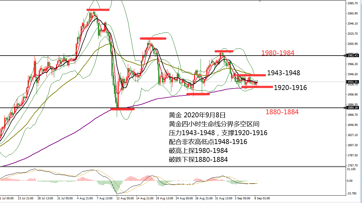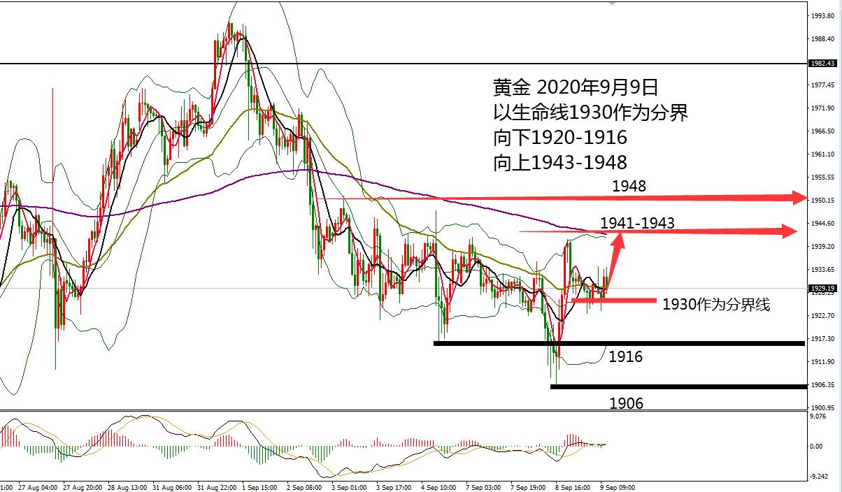 何小冰:黄金1948-1920震荡,原油美盘确定阻力再空 09.09 黄金周一先冲高1941后跌至1924,美盘先跌后涨,尾盘徘徊1930关口,周二先冲高1935.5后跌至1906,美盘先跌后涨,尾盘徘徊1930关口,走大区间震荡运行,不延续是最大的特色。 上周的整体节奏是震荡扫荡的行情,反弹幅度较大,但反弹不是为了反转 ,而是为了加速下探,包括小非农和非农当天的走势也是符合此点震荡节奏。本周重磅消息集中在后半周,在此之前保持的震荡节奏仍将继续延续。 昨日的分析提及到日线四小时和小时图布林带形态均有走平的状况,按照收口--走平--开口的步骤看行情,走平是为了开口做准备, 而时间周线越短开口的