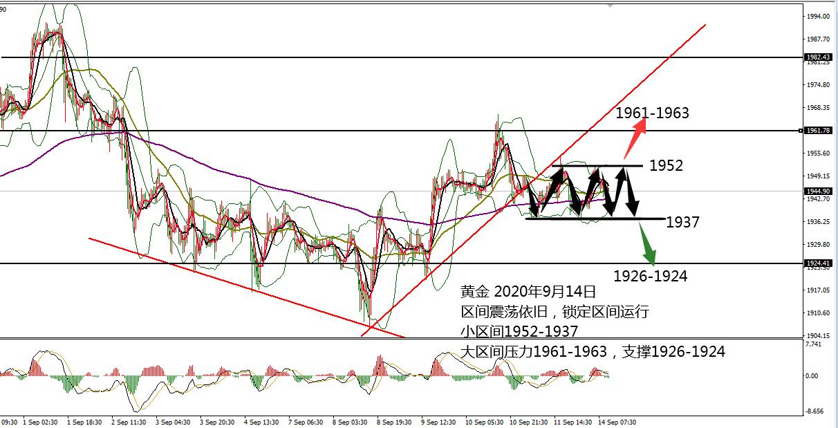何小冰:黄金生命线定多空,非农高低点定区间09.08 黄金周一因美国劳动节假期休市而窄幅震荡,早盘依托1930攀升19401区域,午后承压走低至1924.5,美盘围绕1930上下来回横盘修正结束当天的行情。 由于周一假期影响, 本周重磅消息推迟集中在周四进行公布,各大产品找寻对应的消息,针对关注动态影响信息。 黄金从2075形成的回调开始便是大区间扫荡,伴随着高点下移,低点抬升的走势,整体形成一个不规则的收敛三角形,以四小时趋势线年线作为支撑, 现在也是出于年线的上方区域进行修正,区间支撑1920-1916,压力1943-1948,刚好也是非农高低点位置作为分界线。 日线四小时和小时图布林带
