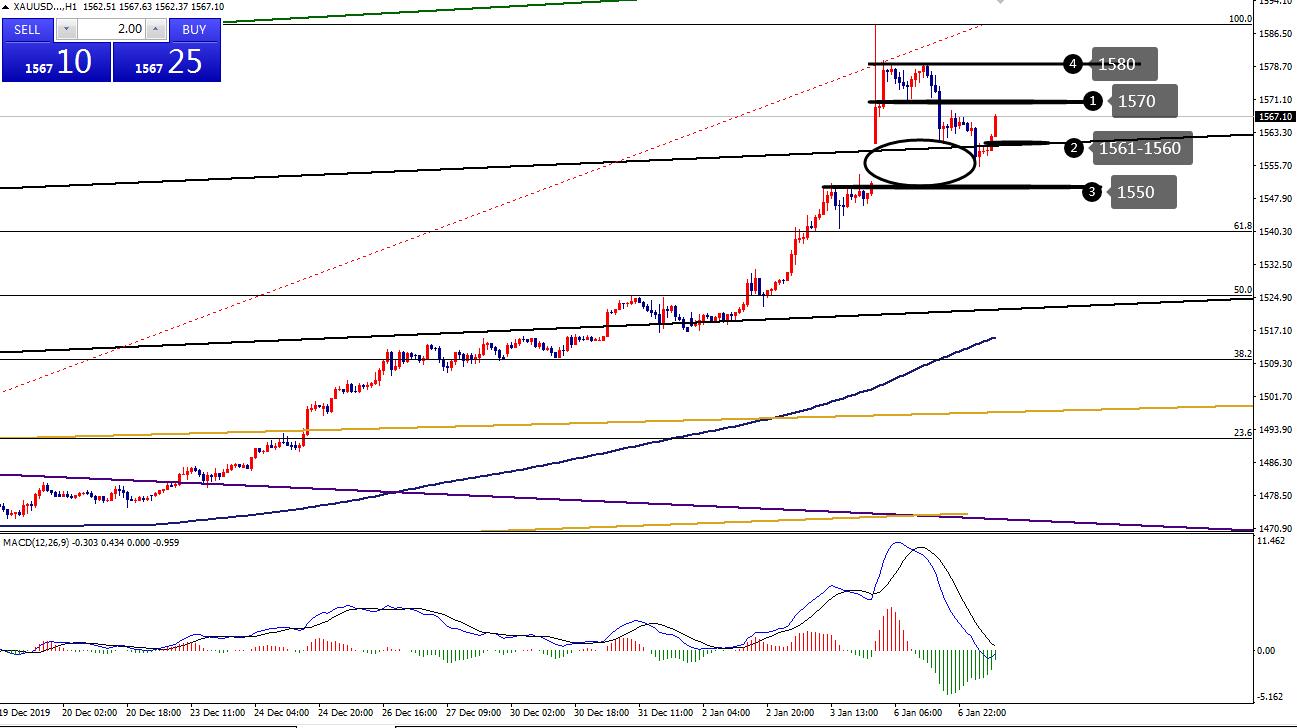 何小冰:避险驱动黄金,顶底转换是关键 01.08 行情回顾: 黄金周一亚盘跳空高开高走,欧盘横盘震荡,美盘承压走低收复涨幅。 周二开盘承压1565.5破低1560下探直至1555,午后开始震荡反弹向上,破开盘高点1565.5后延续上探至1570.8,欧盘反复回踩1564-1563震荡走高,直至午夜前后再破高点1571.5后仍是保持高位横盘调整。 亚盘急跌下探,欧盘探底回升,美盘延续多头走势。 消息方面: 受到中东局势紧张避险影响,黄金1月3日周五强势攀升1550关口,1月6日跳空高开高走刷新高点1588,1月8日再次拉升刷新高点1611.5,而现在局势也并未明朗,经此一役,伊朗草木皆兵,宛若