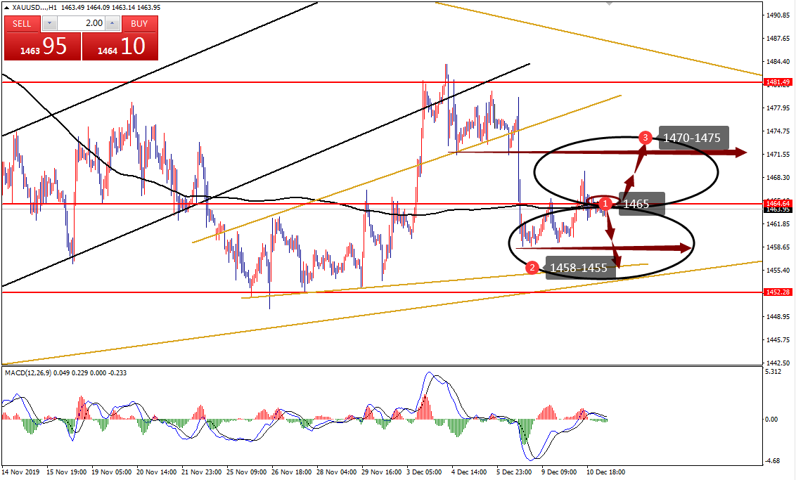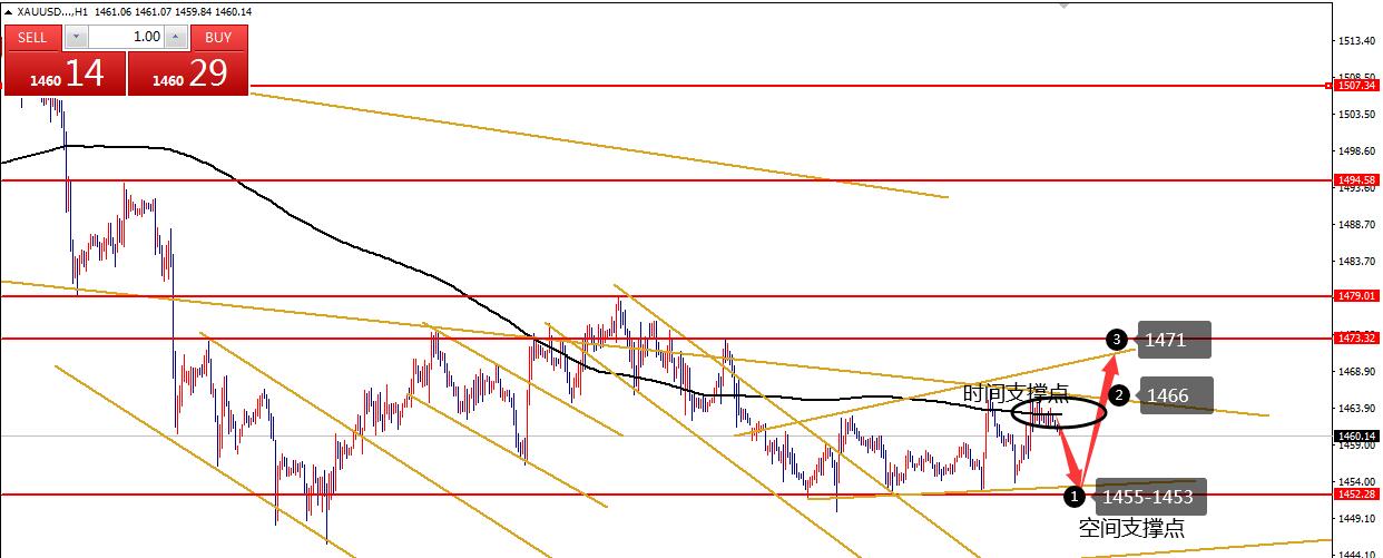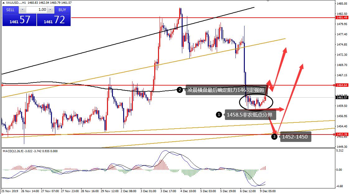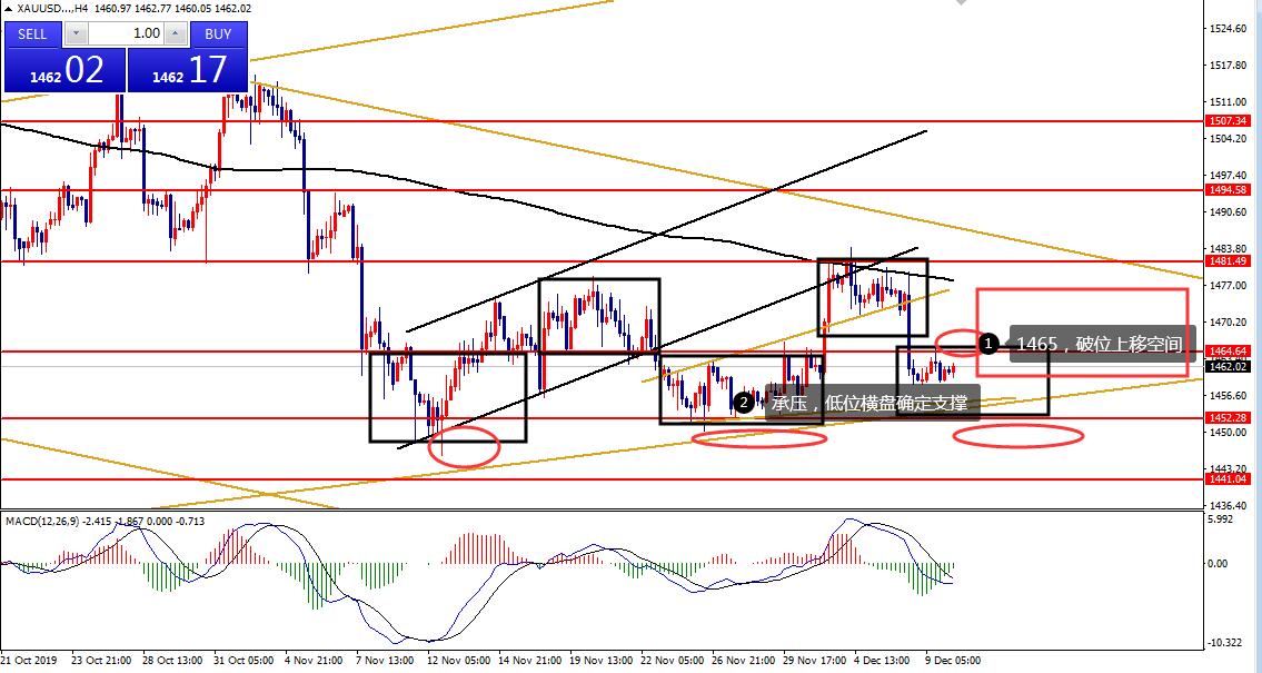 何小冰:黄金短线震荡依旧,1465分界切换区间12.10 行情回顾: 黄金 周一低位开盘横盘修正,反复徘徊1460附近修正,午后开始震荡反弹走高,欧盘延续破位凌晨最后确定阻力1463,美盘小幅回踩1462再次上探至1465,美盘过后反复测试1465未果徘徊修正,尾盘承压再次回落寻找低点1459,围绕1459-1465横盘震荡。 大阴过后,亚盘低位修正,欧盘反弹,美盘延续反弹测试更加关键的压力。 技术分析: 首段落分析维持不变 : 黄金 在此前通过今年的整体行情分析,周线的修正与2月份的上涨后修正的形态和时间周期相似,连续四周的横盘走平区间1480-1450作为启动支撑的区间,能够守住箱体底部