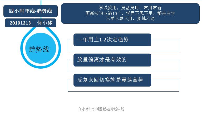 何小冰:知识关键词--4四小时年线定趋势(24) 又是一周的星期五,本周市场面临着抉择趋势方向,所以来谈论一条线,一条帮助我们多次收获中长线利润的线,而这条线在行情形成偏离过后,都能带动趋势放量的出现,从而令中长线的利润放量扩大。 前面已经讲解过找寻支撑阻力,预判顶部底部,布林带运用,黄金分割线,十字星,把控仓位利润心态,单边口诀,预判破位,12字投资真理,生命线及均线运用,盈利后的心态,亏损后的感悟,跳空窗口,早盘急涨急跌,还有很多的实战梳理配合讲解。可以通过回看过往的记录进行查看,每天的交易就是在实战中反复演用,直至最适合自己所用。 揉合到自己的看盘系统里面,取其精华去其糟粕,精益求精,