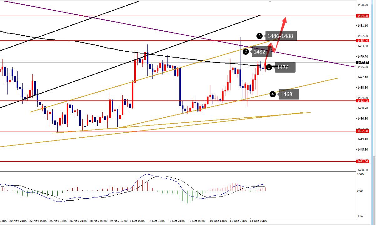 何小冰:黄金站上趋势线,午后1476直接多 12.16 行情回顾: 黄金 周一支撑非农低点1458.5震荡反弹,美盘加速测试1465的压力,尾盘冲高回落,回踩低点1459后继续反弹徘徊1460关口上方。周二亚盘继续横盘1460,午后开始震荡走高,美盘延续冲刺1469,同样是尾盘冲高回落回踩支撑,徘徊1464附近。周三亚盘继续横盘1463,午后开始震荡走高,欧盘破高1470,美盘两度发力拉升至1479,承压回踩1474徘徊。周四亚盘横盘支撑1172,午后震荡走高破位,美盘延续破高冲刺1487,美盘过后冲高回落跌破日内低点后扩大跌幅下探至1463.5,持续低位横盘。周五低位横盘后走高向上,美盘虽