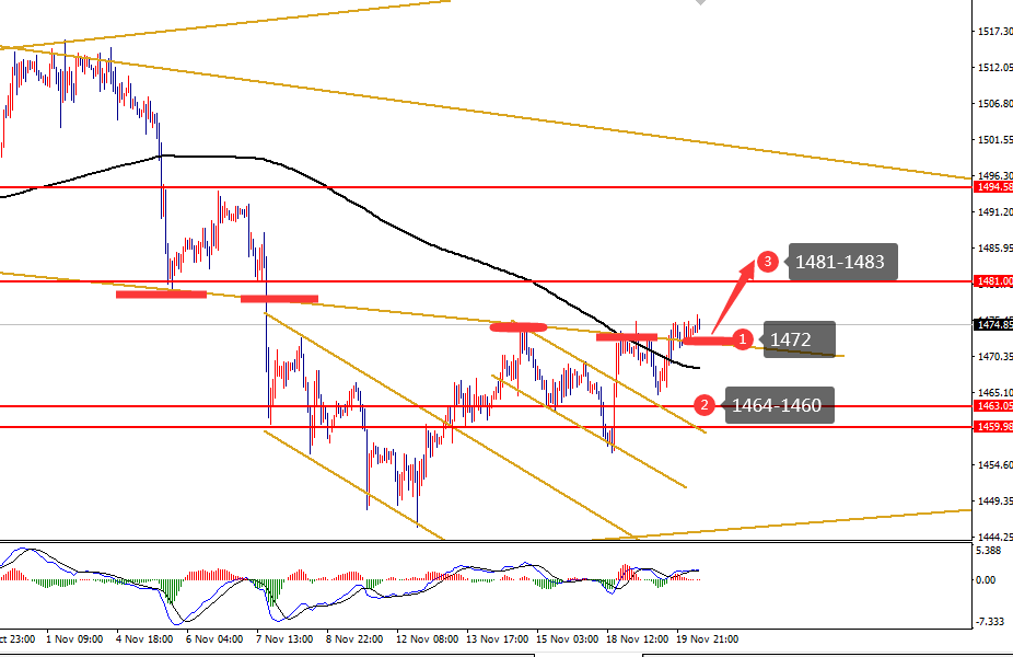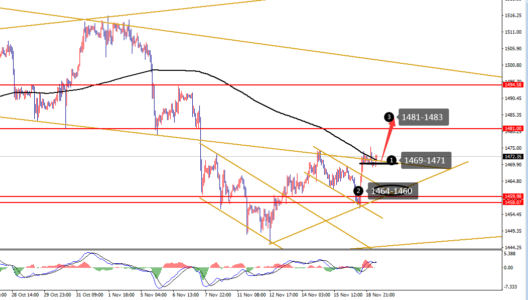 何小冰:黄金低多上看趋势分界1483,欧盘是关键11.19 行情回顾: 黄金周一亚盘承压1469震荡回落,午后继续延续走低下探至1457,美盘前持续低位压制1460下方扩大跌幅下探至1456上方,美盘开盘探底回升直接大阳拉升吞没徘徊1466,小幅回踩1464后再次延续涨势上探至1471,修正1468冲刺1475区域,尾盘高位横盘结束当天的行情。 亚盘承压回落,欧盘延续走低,美盘探底回升,转折时间点21点30前后 技术分析: 黄金 周一通过大周期分析,回踩支撑黄金分割线1445-1448区域的支撑,多头仍是掌握主导权,支撑修正,蓄势待发。 周线 5日和生命线压制叠加1483-1484,而10日