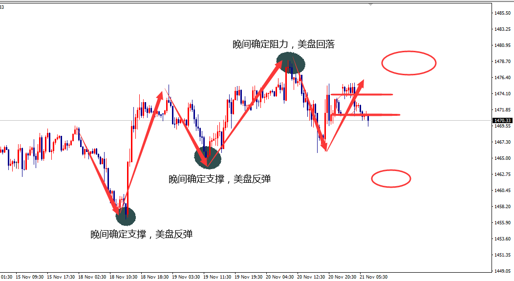 何小冰:黄金1462-1479震荡运行,参考时间点和转折点11.21 行情回顾: 黄金周一亚盘承压回落,欧盘延续走低,美盘探底回升,转折时间点21点30前后。 周二亚盘承压回落,欧盘延续走低,美盘探底回升,转折时间点21点30前后。 周三亚盘高位横盘1473,午后破位新高后,回踩1472形成支撑,欧盘延续破位新高上探至1478,小幅回踩1476再次反弹上探压制1479,接下来行情震荡回落,小时图连阴回落向下,美盘前后再次确定阻力1475形成压制,跌破开盘低点1472后扩大跌幅下探至1469,小幅反弹1473再次放量下挫1466区域,凌晨消息影响,支撑反弹上探承压1475.5回落修正,尾盘收线