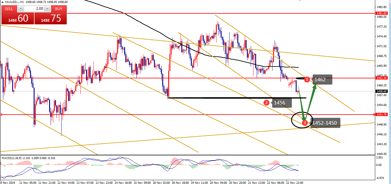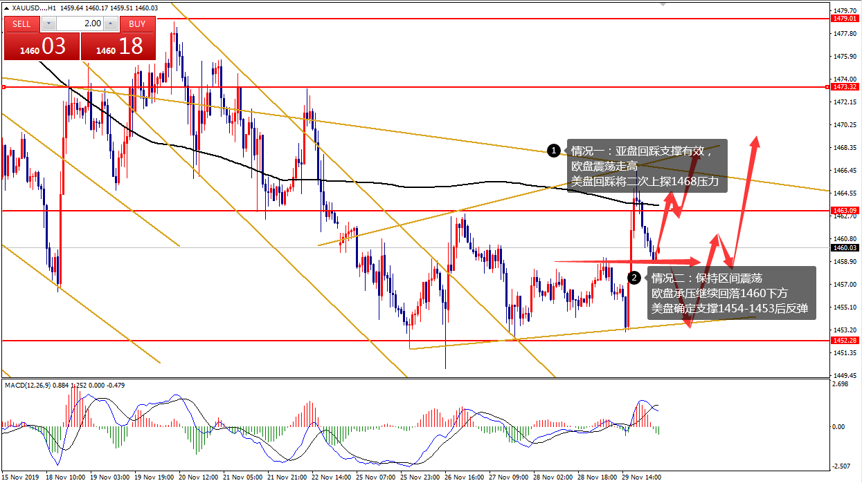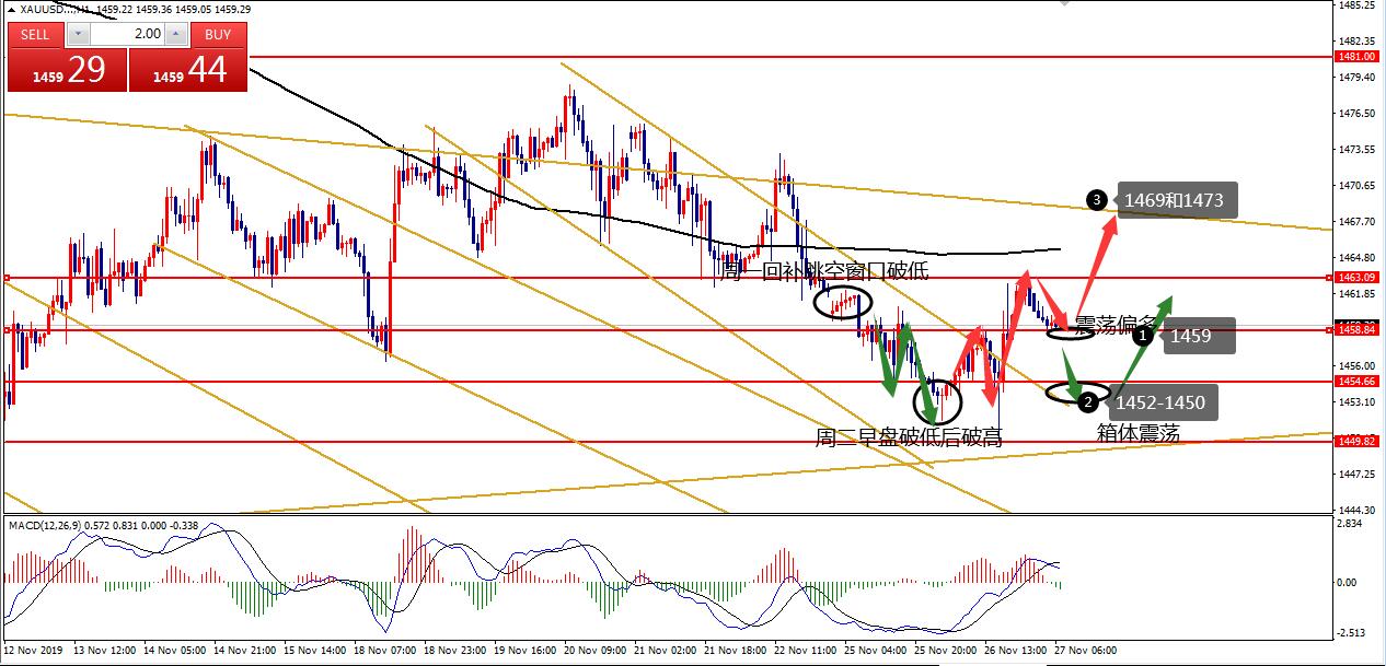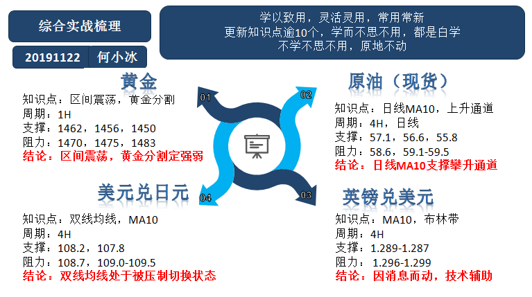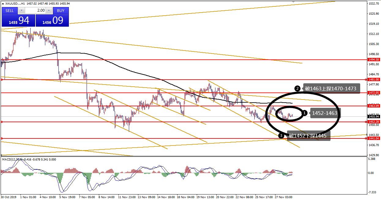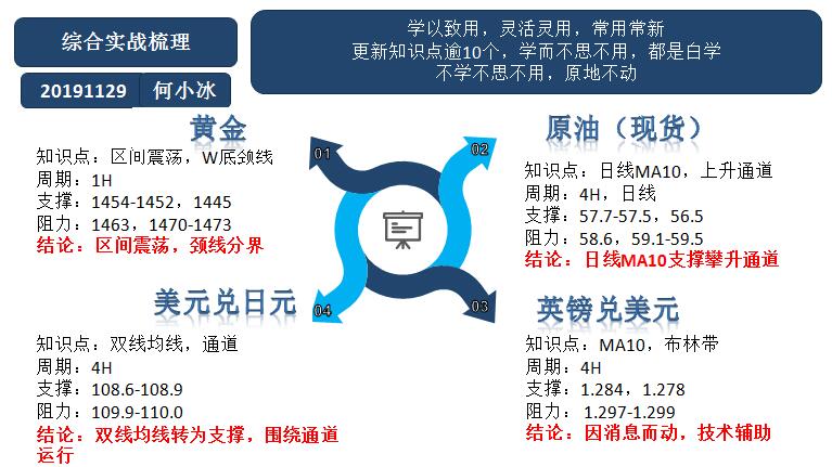 何小冰:2019年11月29日综合实战梳理黄金原油美日镑美 又是一周的星期五,本周由于感恩节假期影响,市场交投清淡,需要强调的知识点相对比较少,也没有新的需要进行提及,继续维持实战综合梳理,整个市场行情蓄势待发,静待一轮行情的启动。 过往的知识点关键词都可以翻看重温,学而不思则罔,思而不学则殆,学以致用,灵活运用,常用常新。 黄金 知识点关键词:区间震荡,W底颈线 支撑:1454-1452,1445 阻力:1463,1470-1473 黄金本周围绕箱体区间反复横盘震荡,形态上并未有太大的趋势方向,而从大周期上,前期承压1514回落后在1445形成启明星形态反弹至1479,刚好是日线生命线位置
