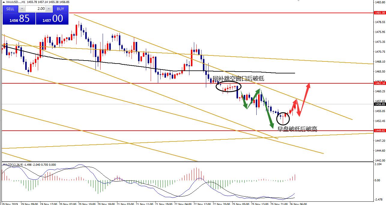 何小冰:黄金早盘破低后破高走震荡,午后1454先多再看空 1126 行情回顾: 黄金周一开盘跳空低开,亚盘回补跳空窗口1462后震荡回落,午后承压破低点,再次反弹确定1460的阻力后震荡回落至1456,美盘前后反复1460-1456横盘,最后确定1460压力后放量下挫至1454,触及支撑快速拉升至1460,最终仍是承压1460下探至1452,尾盘低位横盘修正结束当天的行情。 亚盘回补跳空窗口,欧盘破位走低,美盘守高继续破低。 技术分析: 黄金 仍是维持大周期上的黄金分割回踩支撑1445-1448区域范围的支撑修正,大趋势上多头主导权依旧。 周线 级别5日均线压力1472,而10日均线和生命线