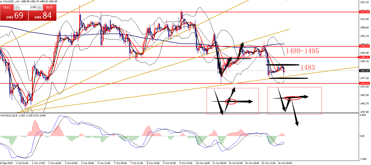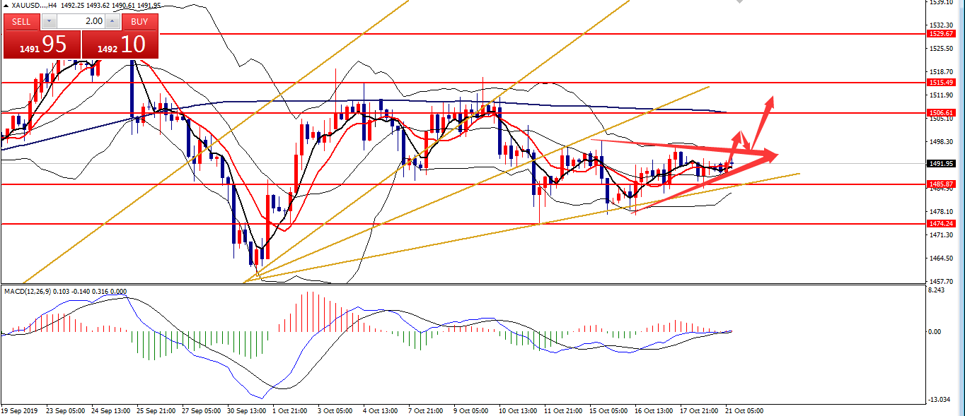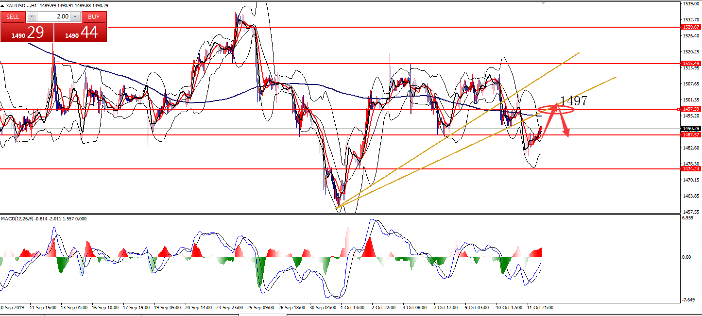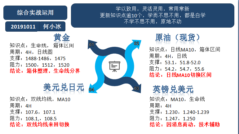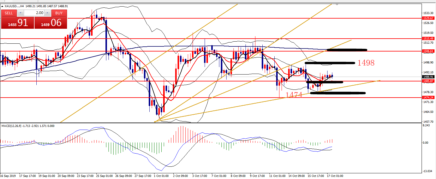 何小冰:2019年10月11日综合实战运用黄金原油美日镑美 又是一周的周五,本周安排的是综合实战运用,对于涉及的早盘急跌急涨在以往的知识点中也已经有讲解过,可以先返回去看,下周会安排时间再配合本周周四的早盘急涨急跌的案例做知识点汇总,方便更深刻的认识以及运用。 本周知识点涉及箱体区间,生命线,MA10,双线均线等等。 黄金 知识点:生命线,箱体区间 支撑:1488-1486,1475 阻力:1500,1512,1520 从上周四形成的冲高回落后,行情下探至四小时下轨支撑1487形成支撑反弹,直至今日仍是处于形成的区间范围1487-1520区域,重新站上四小时生命线后,反复围绕生命线及上轨区域