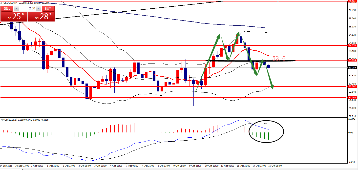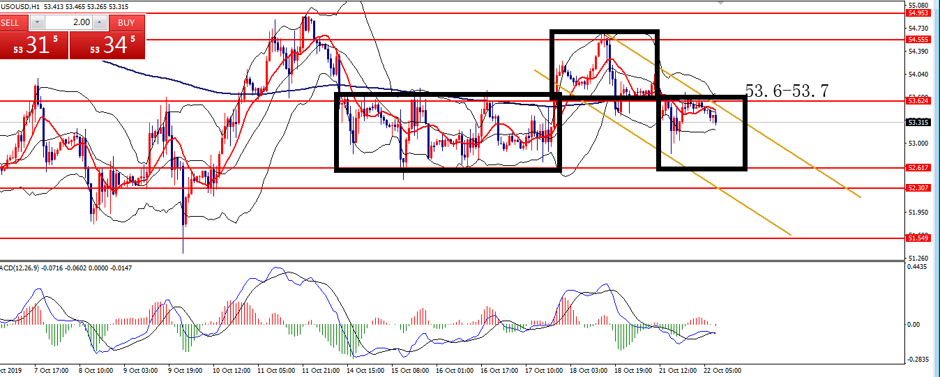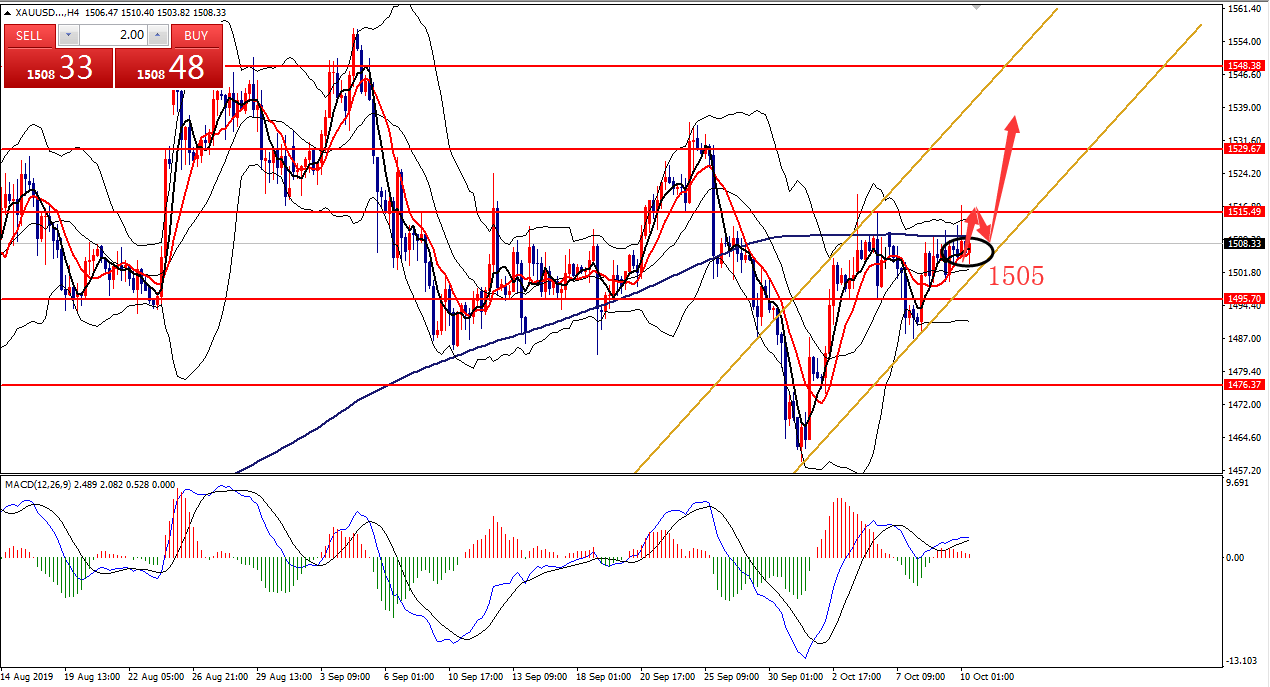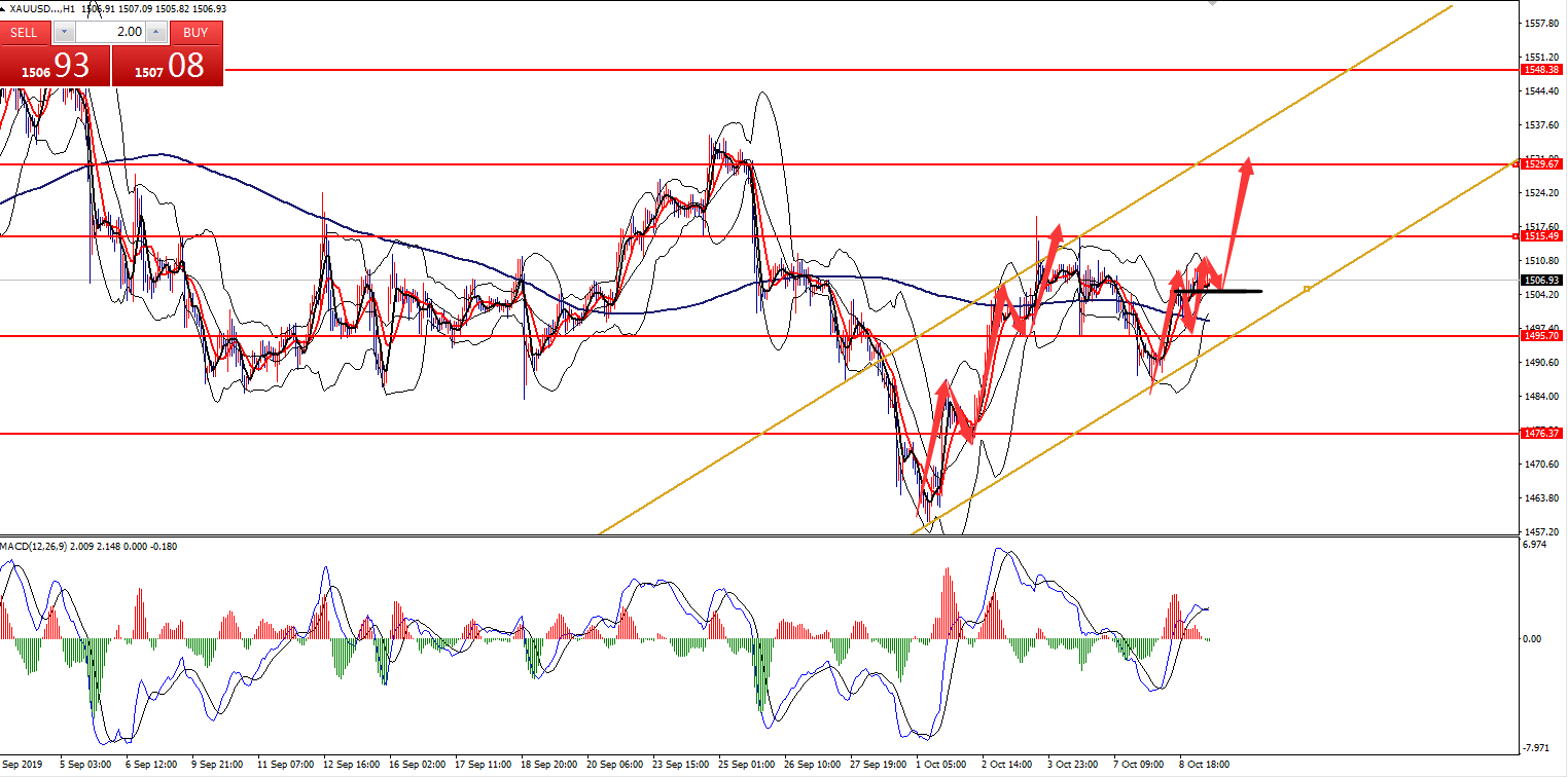 何小冰:2019年10月11日综合实战运用黄金原油美日镑美 又是一周的周五,本周安排的是综合实战运用,对于涉及的早盘急跌急涨在以往的知识点中也已经有讲解过,可以先返回去看,下周会安排时间再配合本周周四的早盘急涨急跌的案例做知识点汇总,方便更深刻的认识以及运用。 本周知识点涉及箱体区间,生命线,MA10,双线均线等等。 黄金 知识点:生命线,箱体区间 支撑:1488-1486,1475 阻力:1500,1512,1520 从上周四形成的冲高回落后,行情下探至四小时下轨支撑1487形成支撑反弹,直至今日仍是处于形成的区间范围1487-1520区域,重新站上四小时生命线后,反复围绕生命线及上轨区域