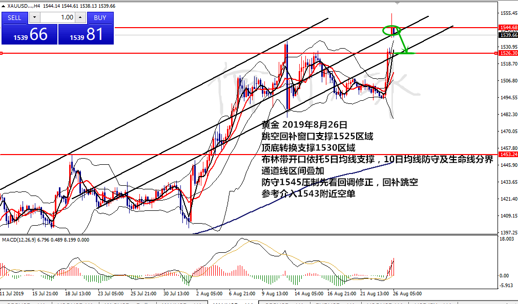 何小冰:黄金分界1545看回补跳空窗口及找顶底转换0826 行情回顾: 黄金周一至周四持续横盘震荡,收窄区间进行修正,周五白盘同样是收窄横盘区间,直至晚间美盘前后贸易战风波再起,机构批量多单砸盘,黄金突破1500关口开始强势猛攻上探1530,尾盘承压徘徊1525附近结束当周的行情。 周一至周四持续横盘震荡,周五突破拉升单边走强。 技术分析 : 黄金 从5月开始拉升,伴随着修正横盘,再拉升破位。1275-1348拉升将近73美元,横盘修正28美元,1330-1440拉升将近110美元,横盘修正60美元,1400-1535拉升将近135美元,冲高回落55美元,横盘修正再次拉升破位,突破1530后
