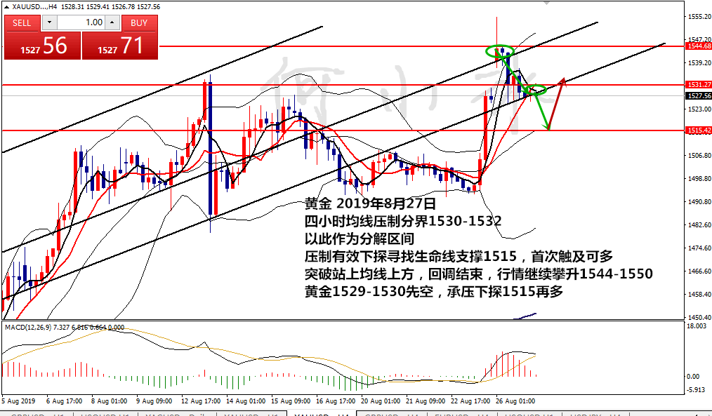 何小冰:黄金首触生命线1515可多,镑美震荡偏空 0827 行情回顾: 黄金周一开盘高开高走跳空1537刷新1555,冲高回落徘徊1542再次测试压力1550后承压下探至1537,二次反弹确定阻力1544后借助机构抛售砸盘空单,跌破1537后加速下探至1527,反弹确定阻力1536后继续下探至1525,尾盘围绕1526-1537运行来回修正。 早盘跳空高开,欧盘前回补跳空窗口,美盘横盘修正。 技术分析: 黄金 周线区间1555-1500,日线回补跳空窗口,压力1557,均线支撑1517-1515,生命线1494,回补结束延续性是关键,收取冲高回落线,预示着短期内还是更多偏向于修正为主,无法再