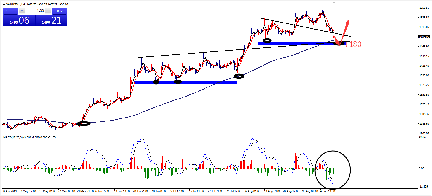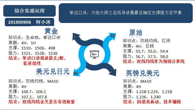 何小冰:2019年9月6日综合实战运用黄金原油美日镑美 又是每周周五,本周来讲解一下实战运用,综合运用已经学习的知识点,黄金此次涉及两个知识点:单边口诀和生命线的使用,原油双线均线和区间范围,镑美MA10均线的支撑分界作用,美日双线均线的分界作用。 没有新的更高呼声的投票产品,将会维持此四个产品进行讲解,想要哪些知识点和实战运用产品,可留言参与投票。 黄金 知识点:生命线,单边口诀 周期:4H ,1H 支撑:1510,1506,1498 阻力:1521,1528,1536 单边口诀的使用运用在出现大阳大阴之后的行情,2018年6月更多的是大阴单边口诀的讲解,今年是大阳单边口诀的运用,在此次的