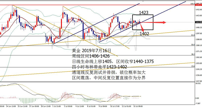 何小冰:黄金锁定布林带区间,1413先空 0716 行情回顾: 黄金周一开盘延续上周五尾盘走势,加速上探至1420,随后承压跌破开盘低点1412,午盘过后探底1409.5反弹至1417,美盘前再次承压下探至1410,反弹确定阻力1415随后加速下探至1407.5,同样的午夜探底回升至1417,围绕区间来回震荡。 亚盘冲高回落,欧盘探底回升,美盘继续来回运行。 技术分析: 黄金 周线5日均线是五月开启单边上涨的均线支撑线,经过三周的横盘调整,均线继续向上靠拢,均线与上轨形成区间1406-1426成为本周重点关注区域。 日线布林带收口区间1375-1440,以生命线作为分界,生命线之上震荡偏多,