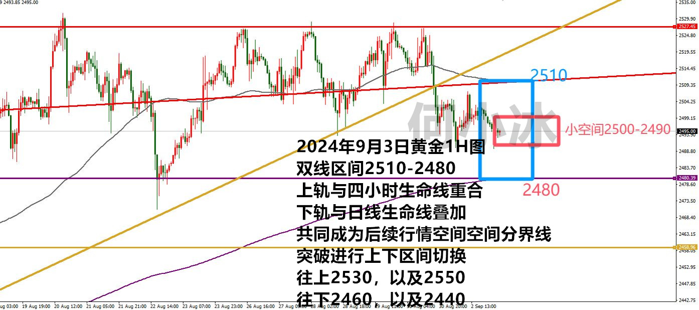 何小冰:2510-2480区间扫荡,主多辅助空 启动时,风风火火,修正时,各种扫荡 从上周突破历史新高过后,开始进入修正模式,反复来回扫荡,一个空间换一个空间的扫荡,冲高就回落,下跌就反弹 主讲就是一个扫荡不延续 昨日周一提及到的注意点,由于假期休市影响,市场交投清淡,并未有打开空间,所以还可以沿用到今日周二 对于接下来的行情来说,首先确定的还是扫荡,其次确定的是区间等待突破,最后再看加速拉开距离 综合思路,需要注意点如下: 1、四小时形态上下轨区间扫荡, 反复测试下轨的位置未有突破,继续保持扫荡,重回生命线上方,将促使价格继续反弹找寻上轨阻力 生命线位置2510区域,与小时图双线上轨重合