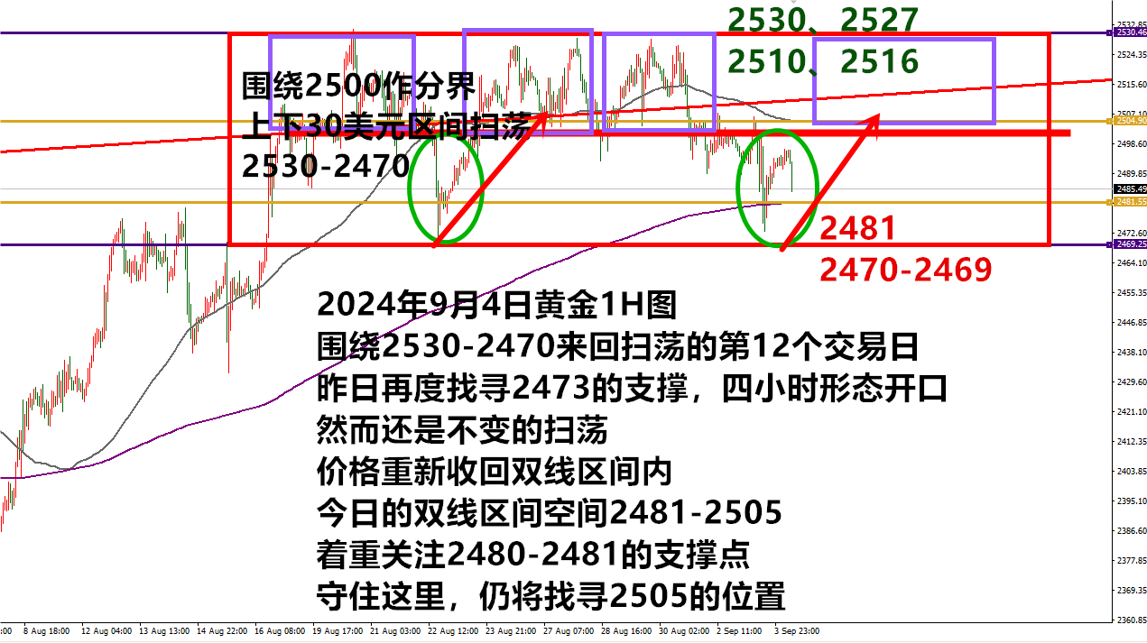 何小冰:守住2480仍将找2505,依旧区间扫荡 昨日周二,金价再度找寻到2473的位置,随着价格跌到这里,四小时形态实现向下开口,不过从午夜开始价格进行反弹,重新将四小时开口的形成拉回到收口,不变的仍是扫荡,只是变了空间 但空间也没有太大的变化,因为价格还是处于2500作为分界的上下30美元区间范围内 上周反复测试2527的阻力,承压回落,跌回2500的下方,下探找寻2473,刚好上下差不多27美元的空间幅度 价格下探过后,又重新回到双线区间内,不变的还是扫荡 冲高回落,下探反弹的扫荡 那 么,对于今日的黄金来说,若是下探2473完成确定支撑的动作,重回双线区间内,下一步便是依托双线下轨2