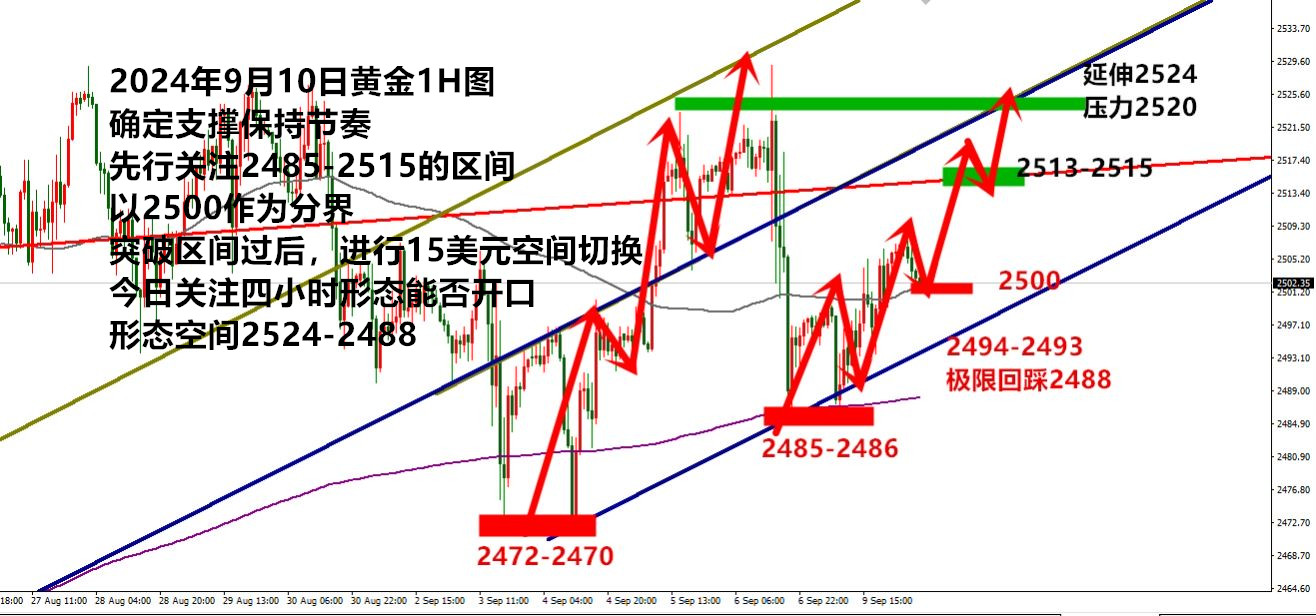 何小冰:守住2500持多看涨,2488是多头的防守线 昨日周一,价格再度确定 上周五的低点2485区域 ,确定支撑后开始震荡攀升走高,先是破了白盘高点2500,美盘扫荡式攀升走高,并且直接收在2500的上方 如此一来, 还是围绕日线的生命线位置进行徘徊和抉择 ,上下选择过后,再看对应的是生命线到上轨的区间,还是生命线到下轨的区间 形态收口区间2540-2462,生命线位置现在在2500关口区域 四小时形态同样是呈现收口走平的状况,上周经历了向下开口未放量重新上涨,向上开口未放量重新下跌 当前四小时形态走平状况的区间2524-2488,生命线位置徘徊2506-2507区域刚好是今日的高点 同样