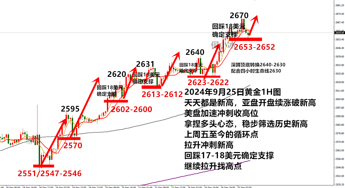 何小冰:金价又新高,今日看涨关注2652和2630的支撑 (嗓子哑了,没办法录制视频,等喉咙恢复了就会开始更新视频录制,感谢关注和支持!) 金价又双叒叕破新高,没有最高,只有更高 两眼一睁就是买涨,睡觉前冥思苦想怎么买涨 涨到让人难以置信,最终还是上涨 从上周五开始回到2620的上方便是出现有节奏的上涨 拉升冲刺过后,回踩17-18美元确定支撑,再继续拉升找高点 偏向于扫荡式攀升上涨的节奏,回踩不是反转,也是为了更好地上涨冲刺 本周还加了一个时间点: 前一日尾盘上涨直接收在高位,次日亚盘续涨破新高,午后回踩17-18美元左右去确定支撑 美盘又开始继续攀升上涨破高,然后直接收在高点 现在这个规