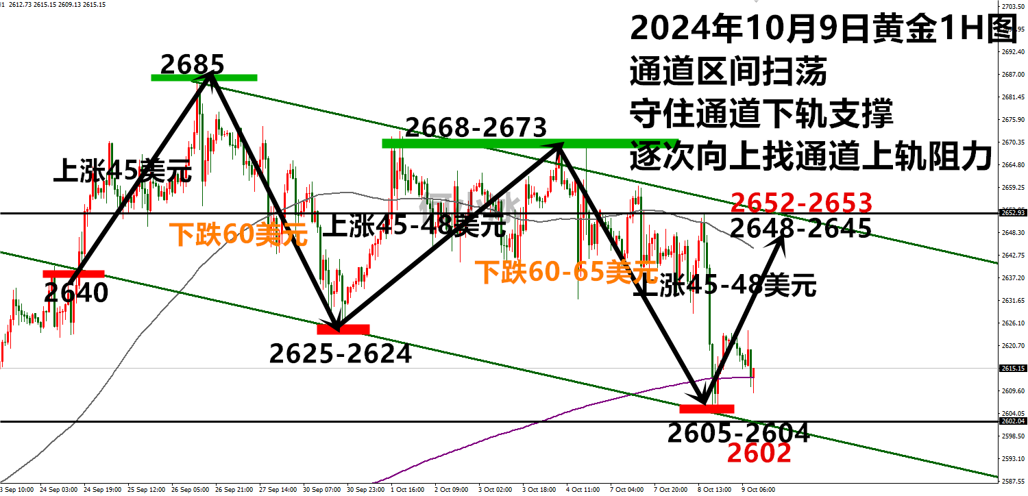 何小冰:金价完成第三次深蹲,通道2602-2652区间扫荡 昨日周二,黄金冲高回落深蹲, 完成了近期的第三个超幅60美元的深蹲动作 ,第一次是9月中旬美联储降息,从2600深蹲下去确定支撑后拉升,第二次是破历史新高2685后深蹲下去确定支撑拉升,但这一次没有破新高,继续围绕60-70美元进行扫荡 而反复确定的阻力区域2668-2673区域, 以此作为压制进入高点下移,低点筛选的扫荡式承压下跌的动作,直至昨日周二10月9日,完成第三次的深蹲超60美元的动作,加速下探至2604-2605位置,触及有所反弹20美元后再度陷入震荡调整 那么,对于接下来的行情来说,我们还是继续进行空间细分,以及节奏细