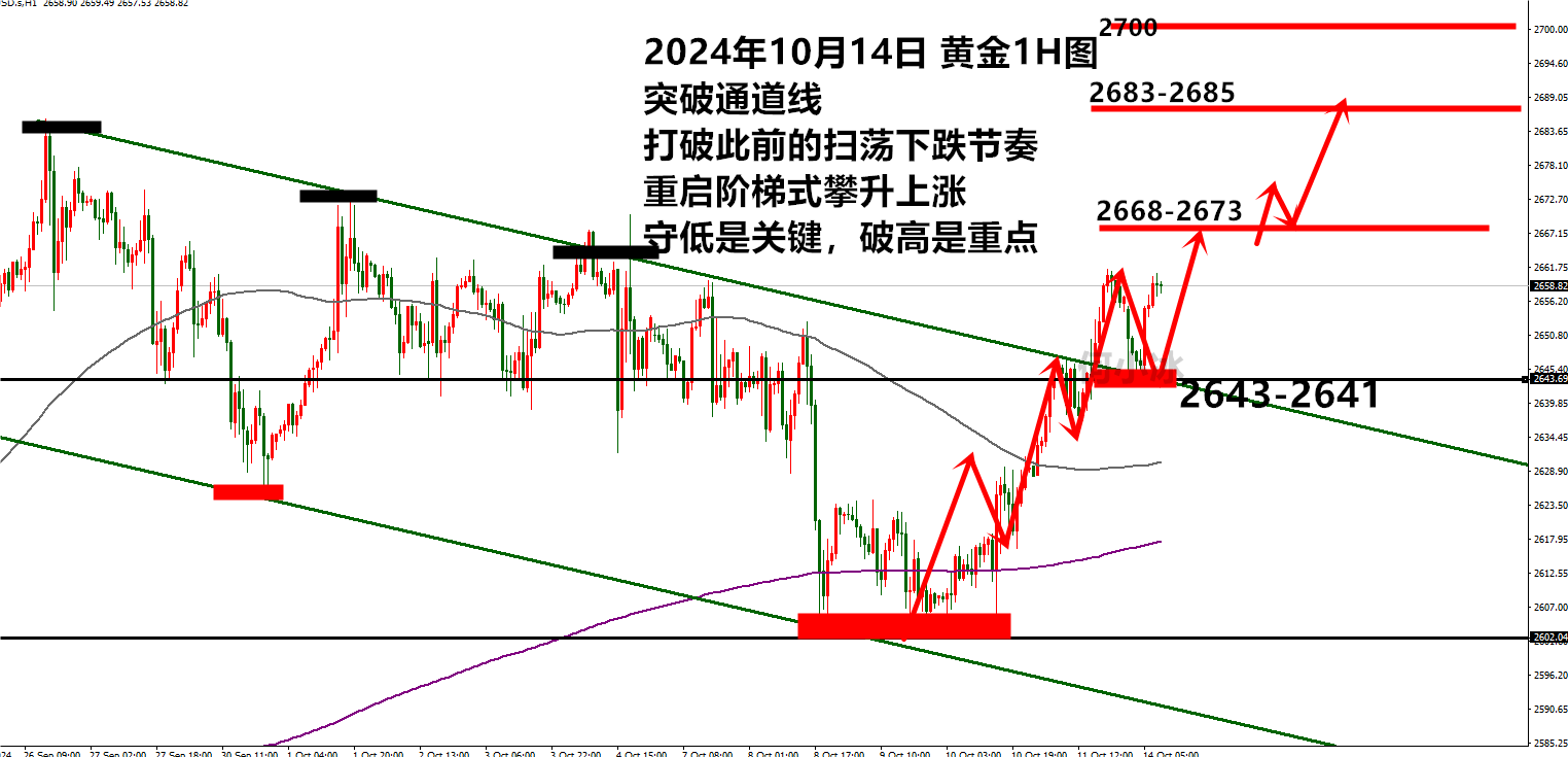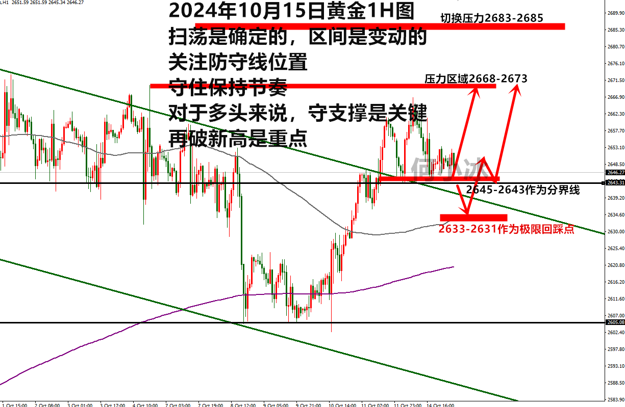 何小冰:金价区间扫荡,探底回升看向2670 时间来到10月中旬,前半个月都是扫荡,只是扫荡的空间各不相同,从前面的下降通道区间扫荡,再到现在突破通道区间后,还是扫荡,继续将扫荡进行到底 在昨日的分析中提及到,支撑叠加2643区域,极限回踩2637-2636位置,直接上涨则不会再给到这个区域的支撑 若是扫荡上涨,则还会下探此处进行确定支撑的动作 随着时间的推移,支撑点也开始下移到2633-2631区域,这个位置刚好就是以2650作为中间点和切换线的位置,从而参考利润空间等距离化原则进行对折同等空间 继续突破继续切换空间即可 对于今日的黄金,我们关注两道支撑区域来进行看行情空间的切换: 1、26