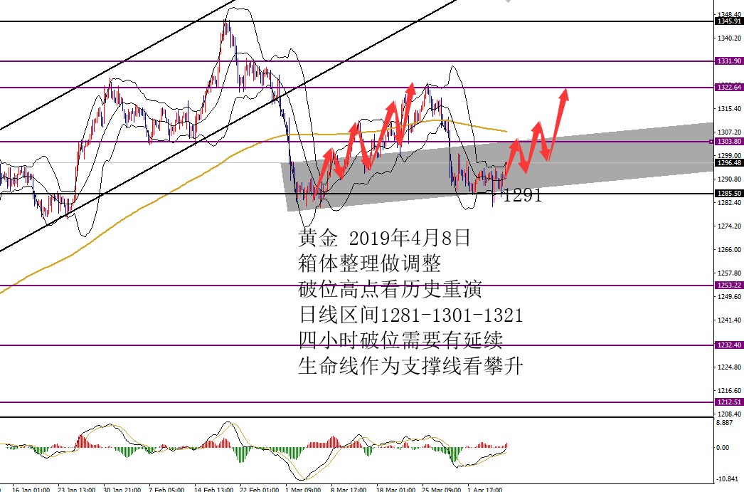 何小冰:黄金1295持破位多,原油63作顶底转换 04.08 行情回顾: 黄金上周持续承压在1293-1295下方,反复测试下方区域的支撑,周四盘中一度下挫至1281,随后探底回升收复失地,周五非农数据利空同样是探底回升重回区间范围,整体节奏保持低位箱体震荡调整为主。 技术分析: 黄金周线 在生命线获得支撑,继续处于生命线和均线区域内,生命线1288,MA5为1299,MA10为1305,继续是区间震荡调整。 日线布林带走平区间1281-1301-1321,双线均线与下轨支撑叠加在1283-1281区域,反复探底回升形成支撑,与前期1月和3月的箱体整理后反弹非常相似,目前正处于大区间的震荡范