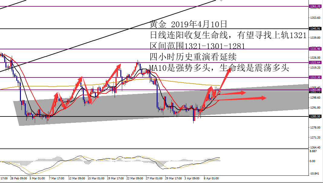 何小冰:黄金已持1301/02多,原油加速十字星 04.10 行情回顾: 黄金周一亚盘支撑反弹破高,欧盘高位横盘,美盘加速冲刺。(破位延续行情) 周二开盘后回踩凌晨最后确定支撑位置96.6随后震荡走高测试千三关口,欧盘二次回踩确定支撑1297震荡攀升,美盘前站上千三关口并持续徘徊在1302,借助避险消息支撑冲刺1306,尾盘收线1300关口上方结束当天的行情。 亚盘回踩支撑,欧盘震荡反弹,美盘延续反弹。(延续走高行情) 行情回顾: 黄金 周线处于均线和生命线支撑,MA10压力1306,生命线支撑1289,收窄区间震荡,日线连阳反弹向上并且站上生命线上方,按照生命线之上震荡偏多,生命线之下震荡
