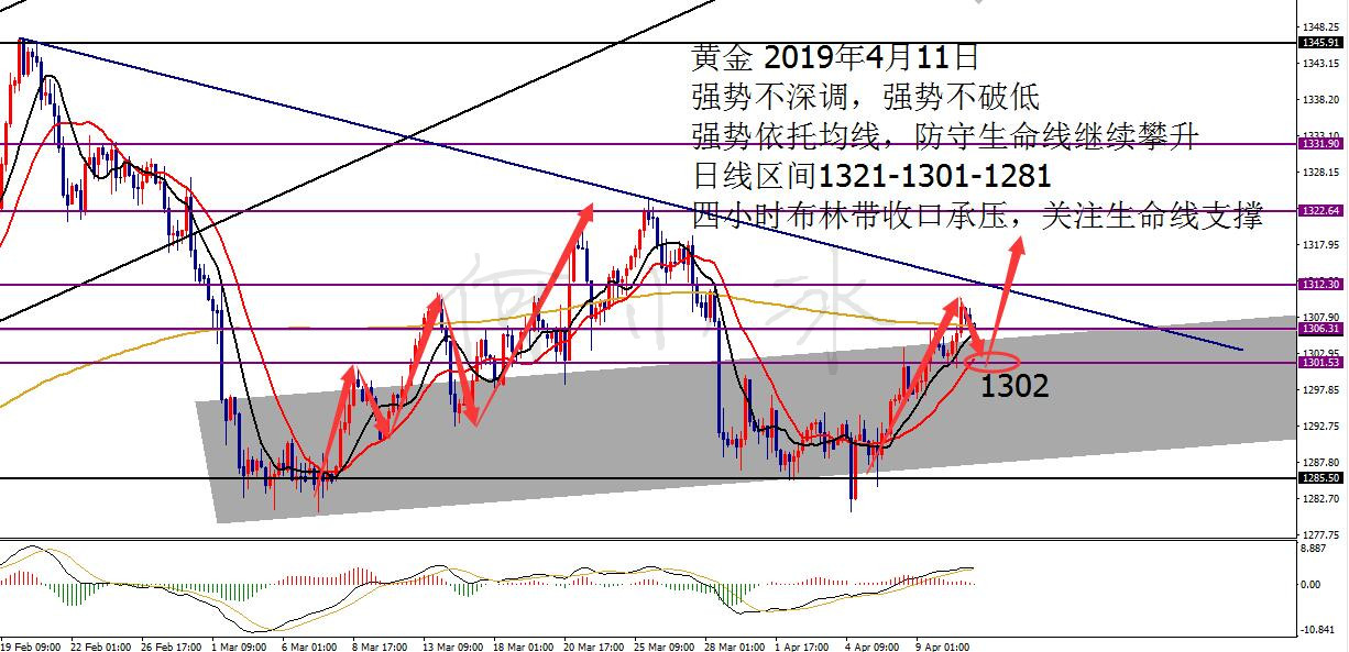 何小冰:黄金连胜低多,1303-02继续低多04.11 行情回顾: 黄金周一亚盘支撑反弹破高,欧盘高位横盘,美盘加速冲刺。(破位延续行情) 周二亚盘回踩支撑,欧盘震荡反弹,美盘延续反弹。(延续走高行情) 周三亚盘回踩支撑1301后反弹测试1306,欧盘反复在这个区域间震荡,直至美盘数据利空再次下探1301形成探底回升拉升冲刺1311区域,最终收盘于1307上方位置。 亚盘回踩支撑,欧盘震荡反复,美盘延续反弹。(延续走高行情) 技术分析: 黄金 周线依托生命线向上测试MA5和MA10的压力区域1306,还有两个交易日,关注K线收线状态。日线三连阳强势反弹拉升,围绕布林带区间1321-1301-