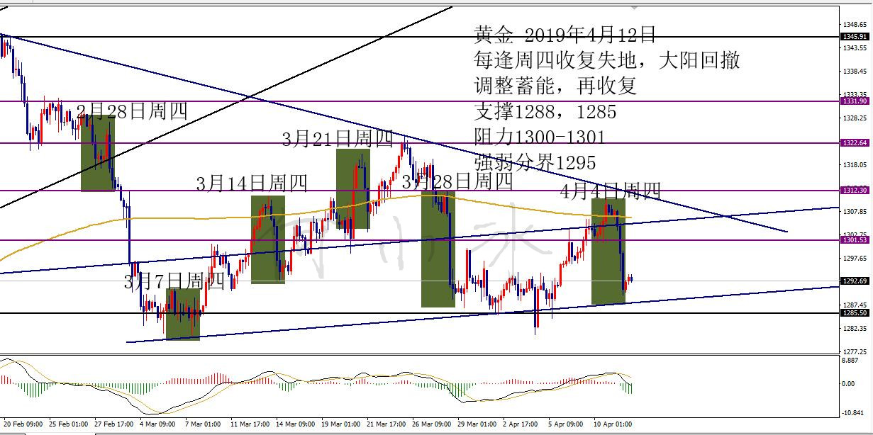 何小冰:黄金七次历史重演,关注1295强弱分界 04.12 行情回顾: 黄金周一亚盘支撑反弹破高,欧盘高位横盘,美盘加速冲刺。(破位延续行情) 周二亚盘回踩支撑,欧盘震荡反弹,美盘延续反弹。(延续走高行情) 周三亚盘回踩支撑,欧盘震荡反复,美盘延续反弹。(延续走高行情) 周四亚盘承压1309小幅回落,午后欧盘再次确定1309的压力随手震荡回落,欧盘加速下探至1303区域,美盘小幅反弹承压1305再次加速下探至1295,午夜前后反弹确定阻力1300第三轮下探至1289区域,低位收盘结束当天的行情。 亚盘反弹确定阻力,欧盘再次确定阻力,美盘破低后两轮加速下探。(反转走低延续行情) 技术分析: 黄