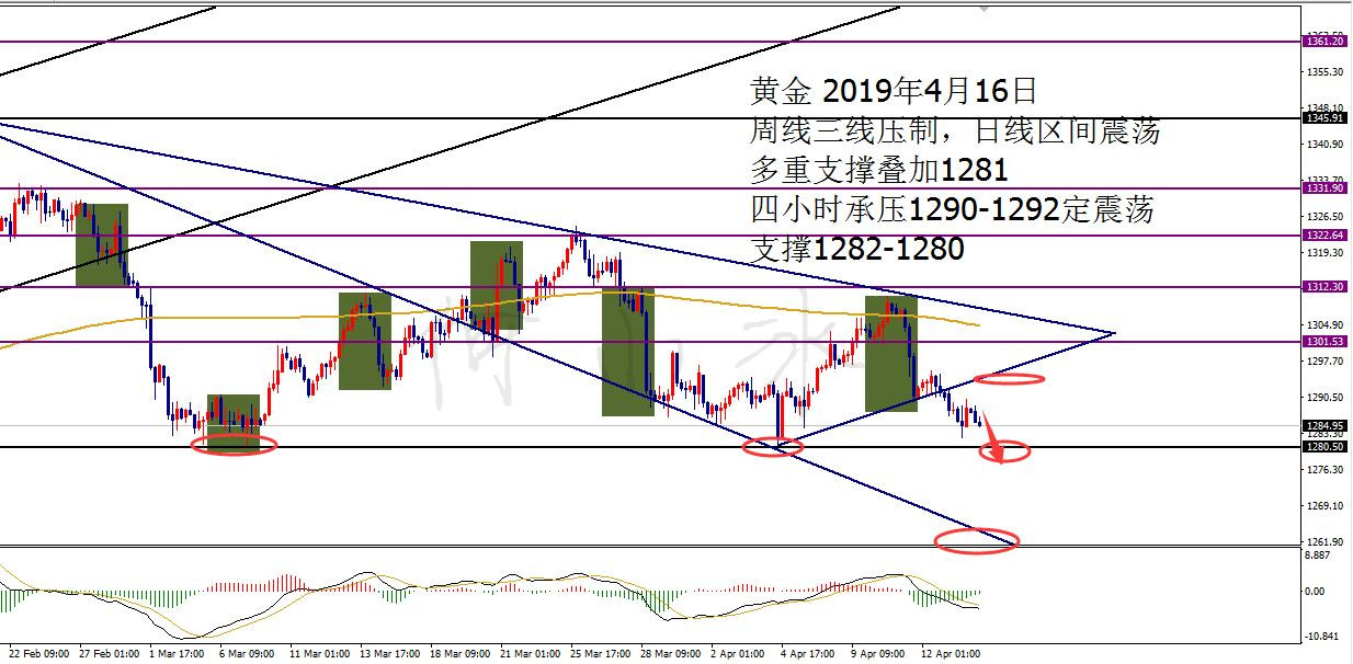 何小冰:黄金1287-88已持空,原油63.6空 04.16 行情回顾: 黄金周一开盘承压上周五尾盘低点1291回落,亚盘承压破位低点,欧盘反弹确定阻力1290二次破位低点至1285,美盘再次确定1289的阻力加速下探至1282.5,美盘过后探底回升走震荡。 早盘急跌破低,欧盘承压二次下探,美盘三次下探,探底回升。(震荡修正行情) 技术分析: 黄金周线 均线压制冲高回落,周初开盘承压生命线1291.5回落,均线压制向下张口MA5(1295.5)和MA10(1302)成为压制,生命线作为强势分界点,需要重点关注得失,下方双线均线支撑区域1276-1266. 日线维持区间1281-1301-13