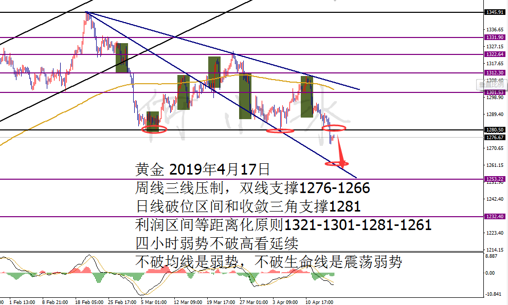 何小冰:黄金1277-79继续空,原油探底回升 04.17 行情回顾: 黄金周一早盘急跌破低,欧盘承压二次下探,美盘三次下探,探底回升。(震荡修正行情) 周二开盘反弹确定阻力1289随后承压回落,午后欧盘再次确定阻力1287后加速下探至1282.5,美盘前反弹确定阻力1285延续下探破位1280加速测试1278,小幅反弹1281后加速下探至1273,尾盘徘徊在1276结束当天的行情。 亚盘承压回落,欧盘延续走低,美盘加速下探破位。(破位单边行情) 技术分析: 黄金周线 三线压制有效,下方双线支撑区域1276-1266已经在测试当中,节奏并未结束,支撑也尚未完全回踩到位。 日线前期的锁定区