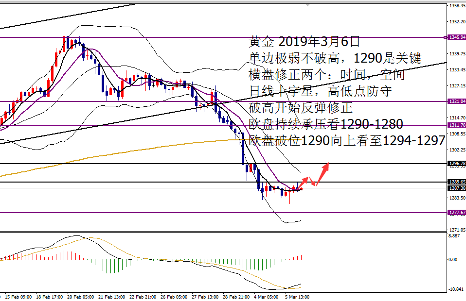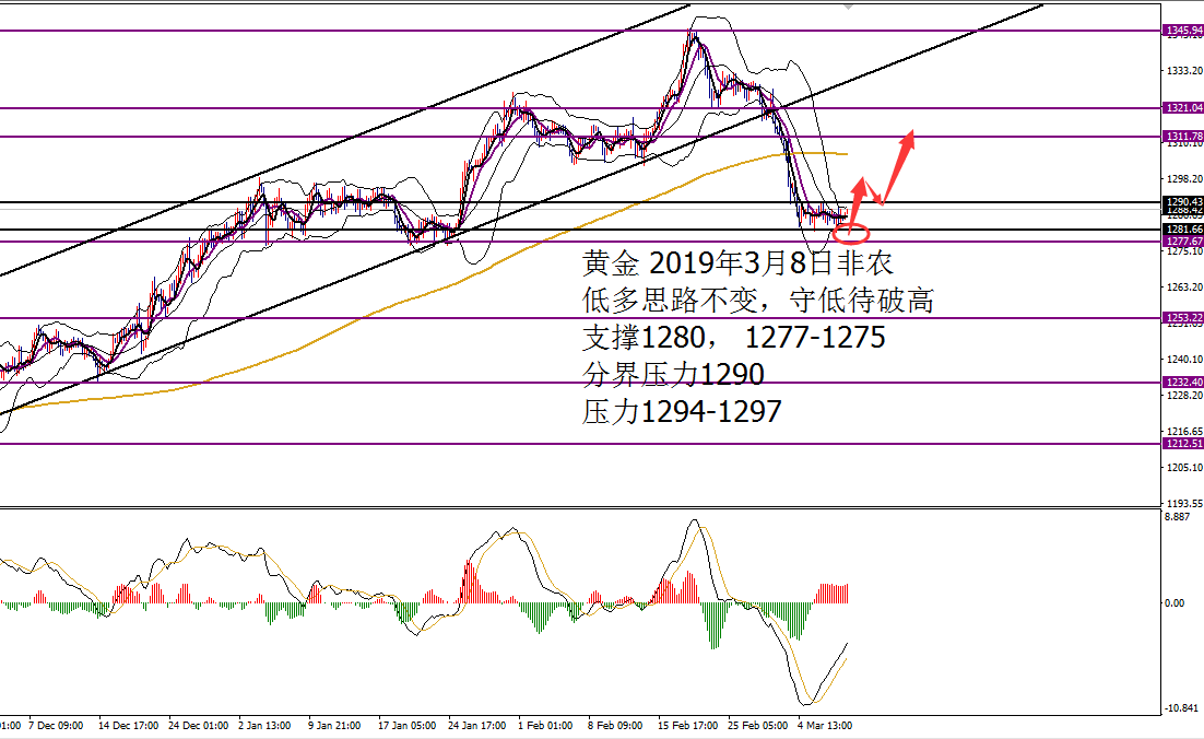 何小冰:非农低多黄金,守低待破高 03.08 行情回顾: 黄金周一大阴之后,亚盘小幅反弹承压凌晨最后确定阻力,欧盘承压破低,美盘延续刷新低点。(大阴之后延续行情) 周二亚盘反弹阻力,欧盘延续承压,美盘加速下探破位新低。(延续行情) 周三亚盘回踩支撑,欧盘冲高回落,美盘冲高回落震荡(震荡行情) 周四黄金开盘承压1288回落,欧盘延续下探至1281,随后探底回升反弹,美盘前后延续反弹至1289,承压回落1282,围绕四小时布林带区间1280-1290横盘震荡,直至收盘。 亚盘反弹阻力,欧盘探底回升,美盘延续后承压震荡。(震荡行情) 技术分析: 黄金 周线大阴回撤,跌破5日10日均线支撑转为压力5
