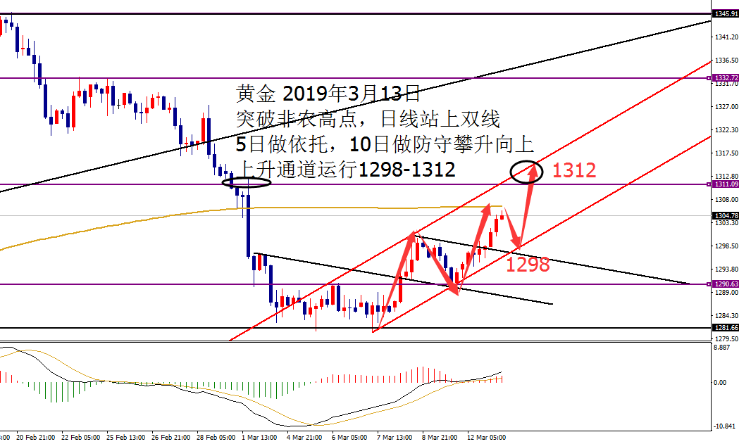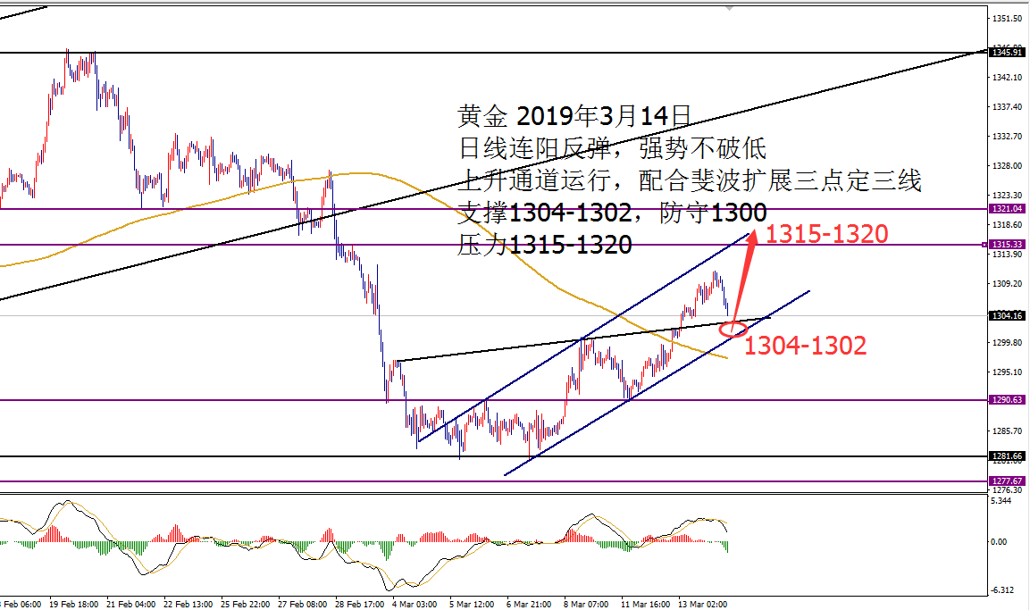 何小冰:黄金加速点1310,事不过三 03.19 行情回顾: 黄金亚盘承压1302回落下探至1298,午后短线拉升重回1302上方,欧盘依托1302震荡反弹向上,美盘延续上探1307,高位横盘结束当天的行情。 亚盘承压回落,欧盘探底回升,美盘冲高回落。(震荡修正行情) 技术分析: 黄金周线 面临着抉择,大阴之后小阳调整反弹,目前正在测试5日10日均线粘合压力位置1306-1308区域,能够再本周站上此区域上方,并依托均线支撑向上攀升冲刺,多头牛市将重回。 日线仍是处于10日均线1298,以及生命线1308区域运行,相对比较好的信号在于5日和10日均线交叉向上平行,预示着行情向上震荡攀升的可能