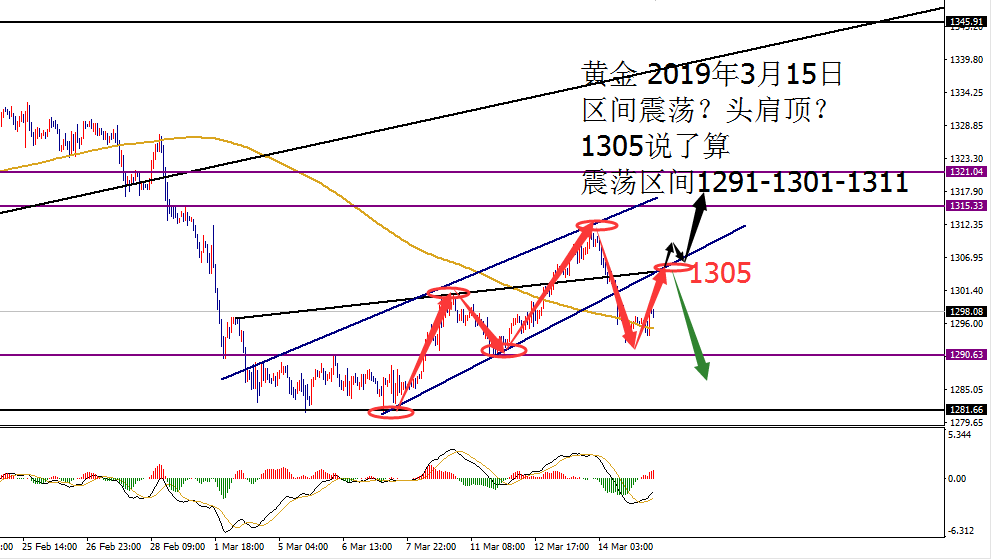 何小冰:黄金头肩顶or区间震荡,原油强势低多 03.15 行情回顾: 黄金周一亚盘支撑反弹,欧盘横盘震荡,美盘承压回落支撑徘徊。(震荡未延续行情) 周二亚盘支撑反弹,欧盘横盘慢涨,美盘再次回踩欧盘支撑向上攀升。(延续反弹行情) 周三亚盘支撑反弹破新高,欧盘延续再破新高,美盘二次冲刺高点。(延续反弹行情) 周四黄金承压1310回落,午后徘徊在1303-1302,欧盘开始后短线下挫跌破1300关口下探至1296,美盘前小幅反弹1299继续二次下探至1293,尾盘低位横盘结束当天的行情。 亚盘承压回落,欧盘破位低点,美盘延续二次下探低点。(延续下跌行情) 技术分析: 黄金 周线双线均线压力下移13