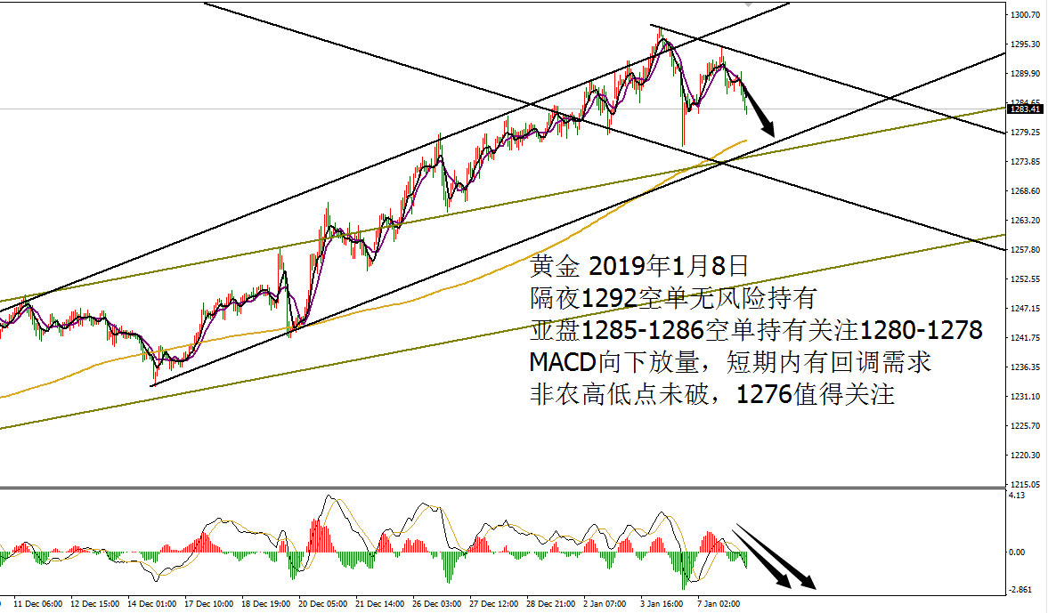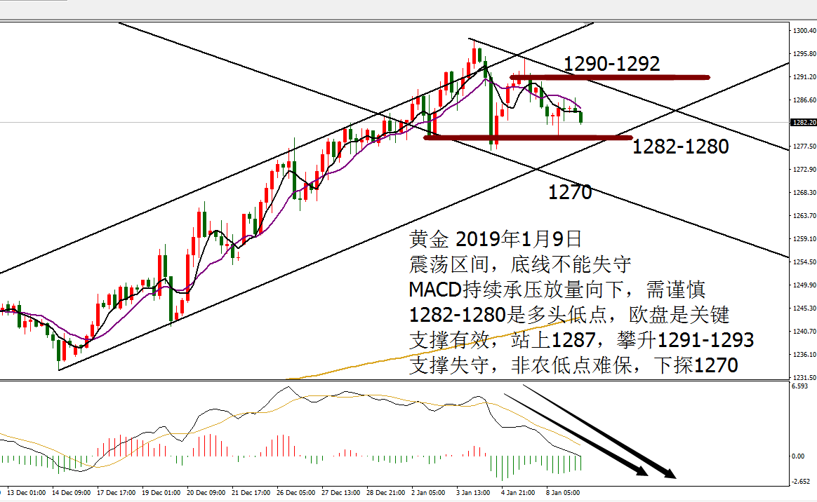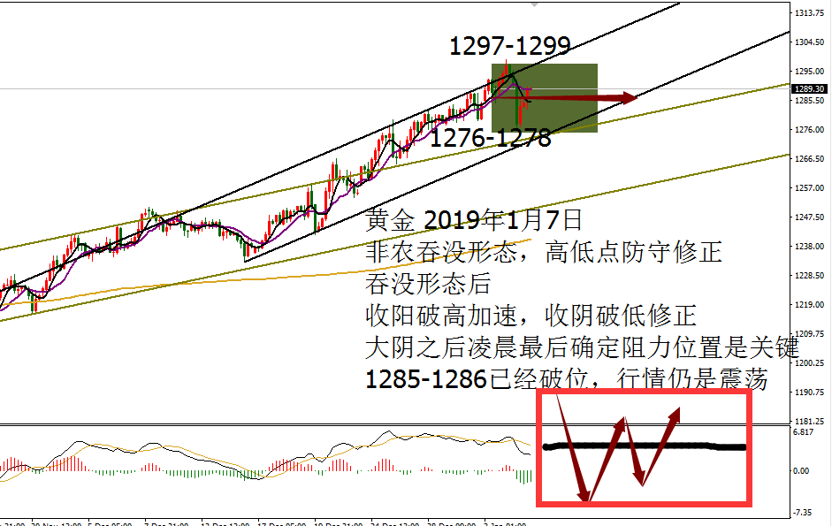 何小冰:黄金亚盘1285已空看修正,外汇仍处调整区 01.08 技术分析: 黄金周一开盘依托1282-1283震荡反弹向上,突破上周五尾盘凌晨最后确定阻力位置1285-1286后继续向上攀升,欧盘站上1290关口,美盘加速冲刺1295,美盘过后承压1295回落至1286,最终收盘于288关口。 大阴之后,次日突破凌晨最后阻力位,欧盘涨,美盘延续。(何小冰单边口诀实战运用) 黄金 周线三连阳后,收取冲高回落小,展现上方压力强劲。2018年6月中旬起跌口1303-1305区域将是下一轮行情的分界点,2018年年初箱体整理至今的区域形成1367-1160黄金分割0.618位置1286及0.5位置1