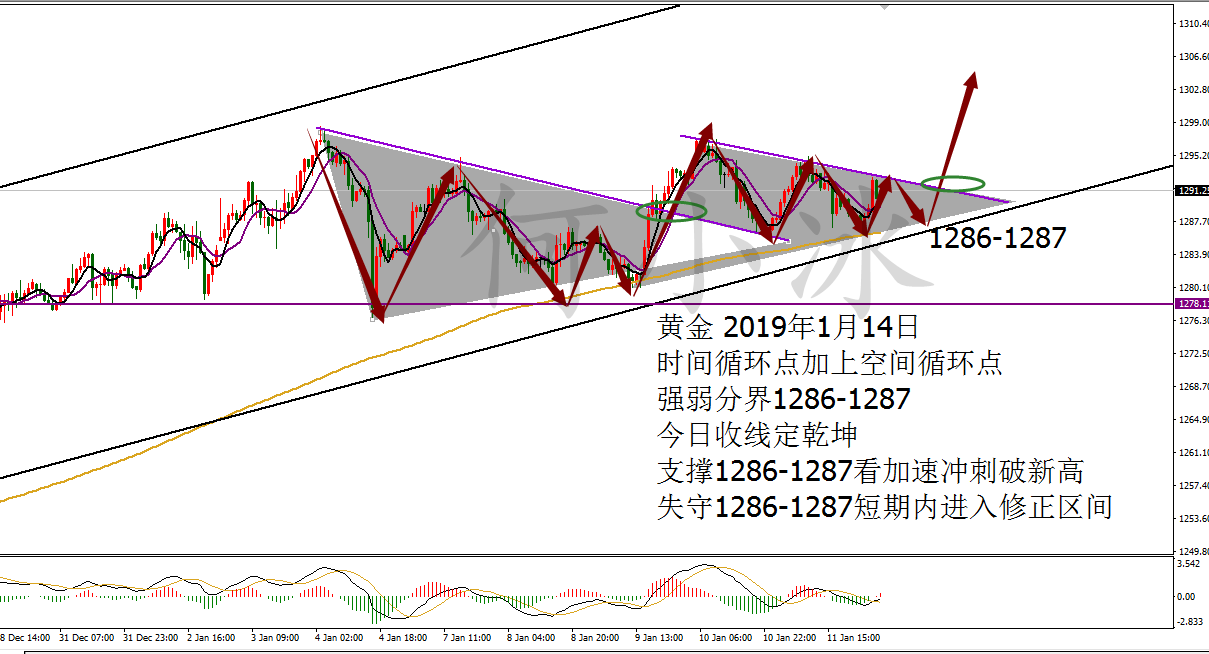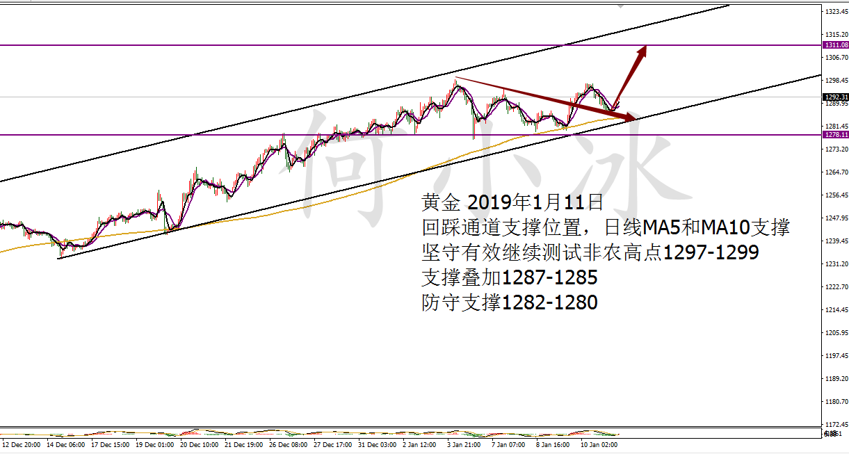 何小冰:时间循环点即将启动,该多的还是要多 01.11 技术分析: 黄金周一大阴之后,次日突破凌晨最后阻力位,欧盘涨,美盘延续,美盘过后反向(何小冰单边口诀实战运用)。 周二亚盘延续凌晨走势,欧盘承压低位横盘,美盘前延续,美盘过后反向。 周三亚盘冲高回落,欧盘低位横盘守住低点,美盘绝地大反弹(震荡逆向思维)。 周四亚盘开盘1291直接拉升至1297,欧盘承压回落下探至1291,美盘前承压下探至1288区域,午夜延续下探至1286,随手小幅围绕1290下方进行修正调整。 亚盘延续拉升,欧盘高位横盘守住高点,欧盘承压回落美盘延续(震荡逆向思维)。 黄金 此轮拉升起源于8月中旬的1160,维持两个
