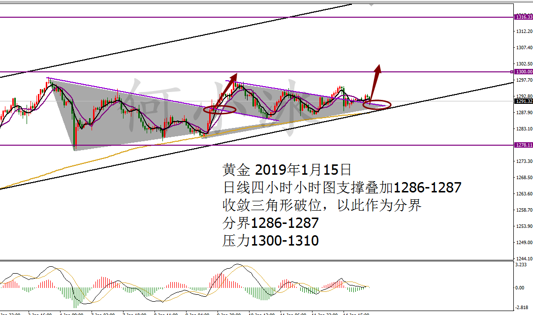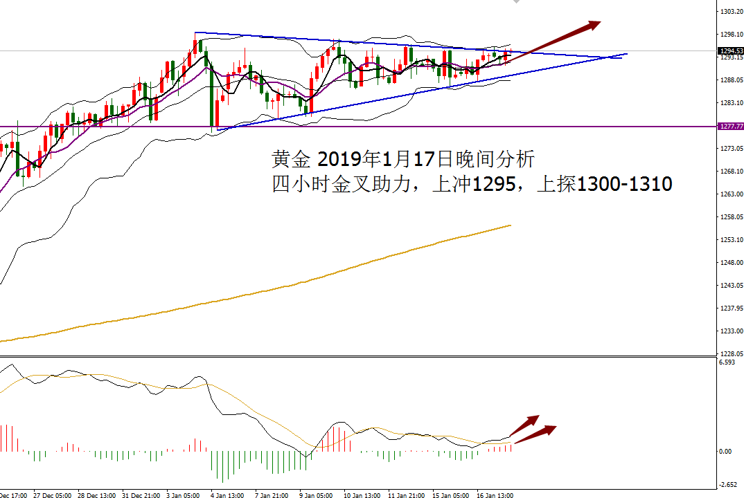 何小冰:晚间黄金1294-1293直接做多看破冲刺千三关口 01.17 黄金自非农承压1299回踩1278后,持续处于此区域将近两周的时间,形成收敛三角形形态调整。目前已经到达最末端形态上。 前期分析此轮破位行情,回踩确定支撑的时间点均是在每个月的中旬,现在中旬时间已经到位,行情回踩的最大限度也就是1278-1280-1286-1288,低点上移,高点持平走横并收窄区间。 日线5日10日均线支撑于1290,四小时MACD勾头金叉向上,鳄鱼开口,均线支撑1292之上看好拉升破位向上测试1300-1310区域关口。 晚间1293-1294区域直接做多,止损1288,目标1300-1310区域