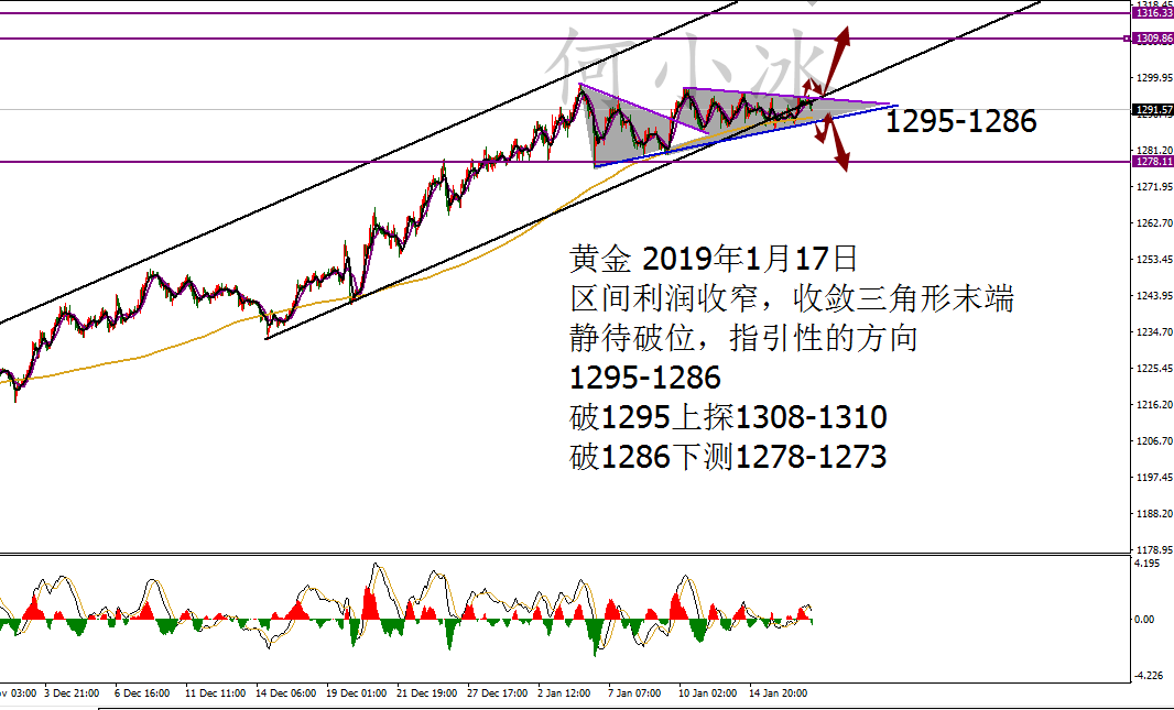 何小冰:多空终战,收窄区间蓄势待发 01.17 技术分析: 黄金周一亚盘依托反弹,欧盘横盘震荡,美盘回踩开盘低点后拉升横盘。(区间震荡) 周二亚盘反弹确定阻力,欧盘延续走低,美盘探底回升后承压下探。(区间震荡) 周三亚盘反弹承压1293回落,欧盘加速下探至1287,美盘探底回升后承压1295,高位横盘结束当天的行情。 亚盘反弹确定阻力,欧盘延续走低,美盘探底回升后高位横盘。(区间震荡) 黄金 周线连收取两根调整K线,预示着行情或是加速新区间,或是要开始维持两个月的横盘修正,5日均支撑叠加在1280关口,调整K线高低点破位是关键。 日线级别小阳小阴交替震荡,目前仍是依托着5日10日均线,生命线