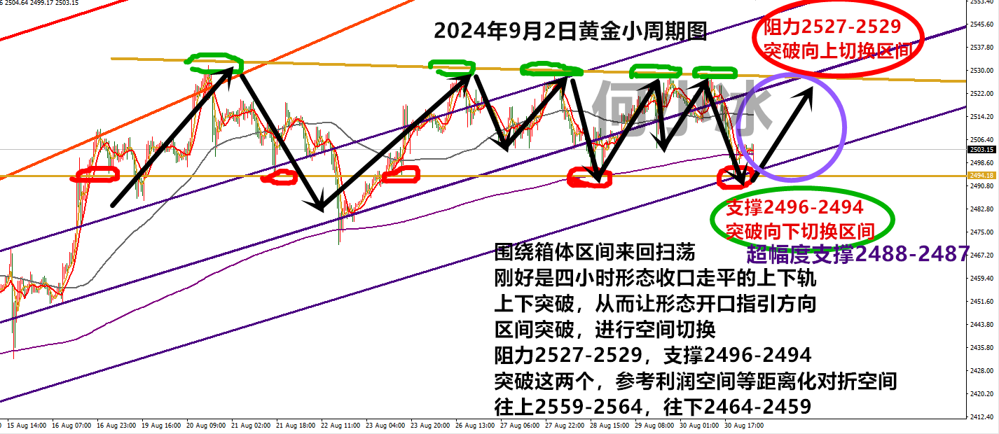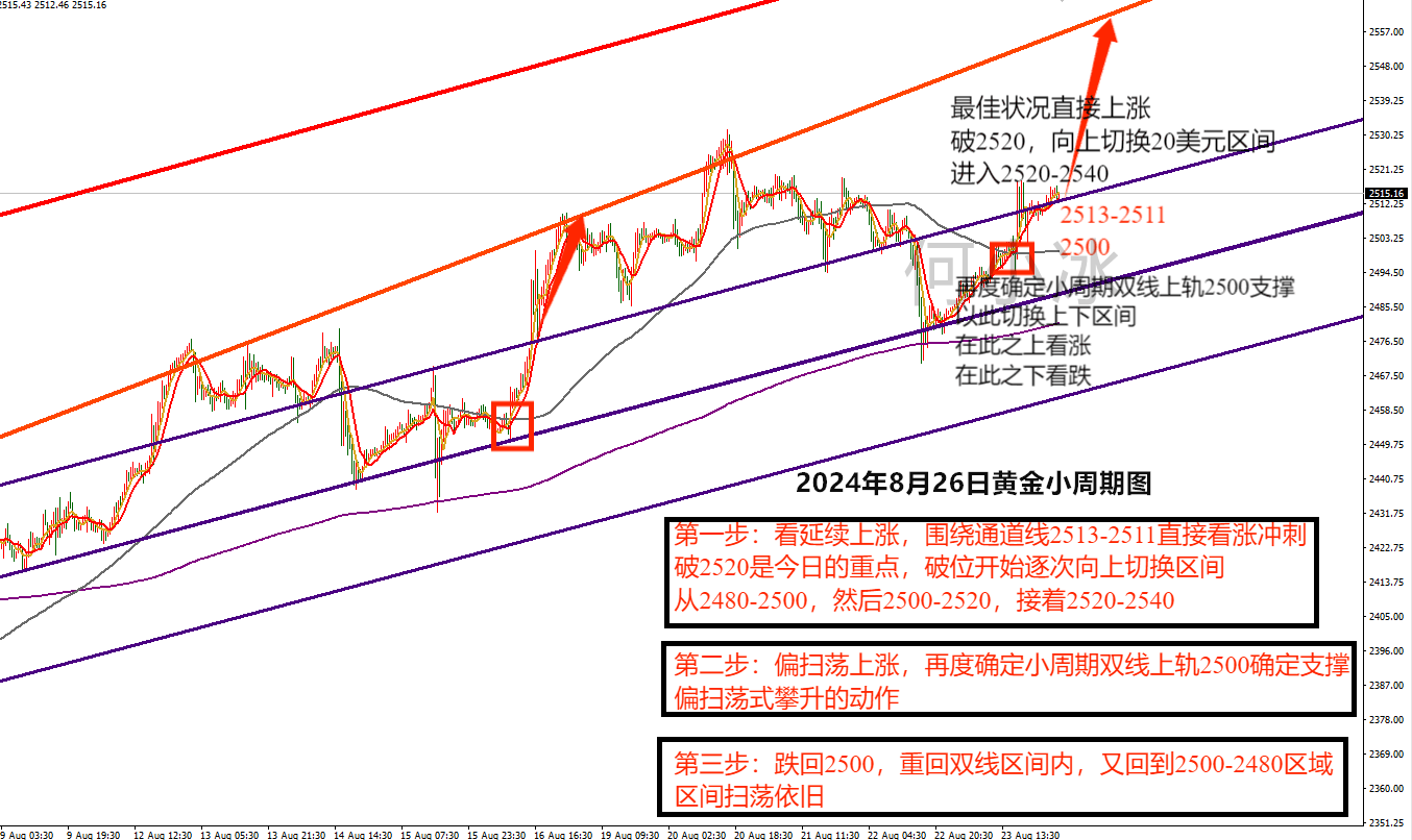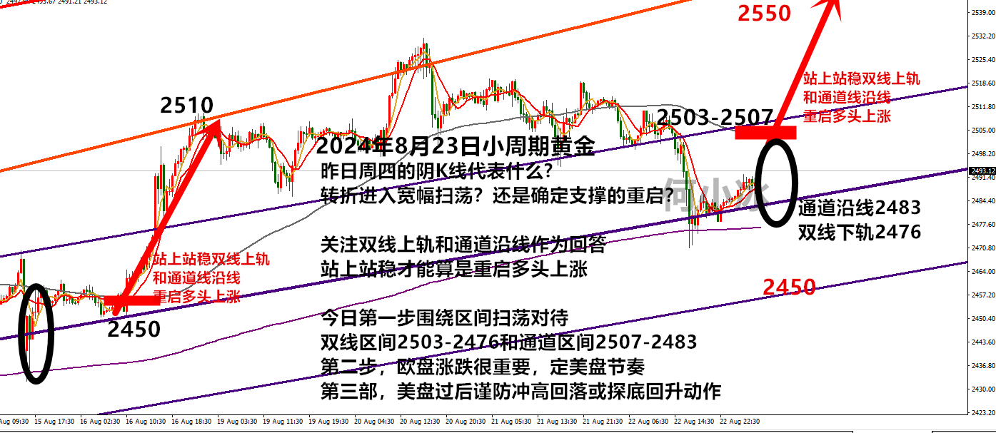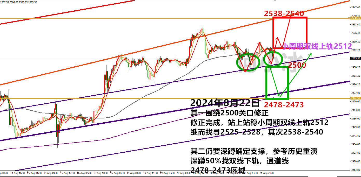 何小冰:在 买涨买跌中试水,站稳2500再重启多头上涨 历史循环再现的关键:在于站上站稳小周期双线上轨和通道沿线位置(2503-2507) 能够实现这一步,昨晚周四的深蹲就是历史重演,循环回踩确定双线下轨的支撑后,重启拉升冲刺,继而往上再冲新高,空间幅度参考90-100美元左右 如若不然, 将进入短期的大区间扫荡模式,当前围绕2500关口上下30美元的区间扫荡,幅度再扩大20美元,便是2450到2550区域,而 刚好2450是这一波上涨的加速起涨点(上周五反复确定此处的支撑,形成上涨冲刺),而2550是非常魔性的红色上升趋势线沿线位置,作为近期的反复压制线。 对于今日周五来说,首要一点,就是