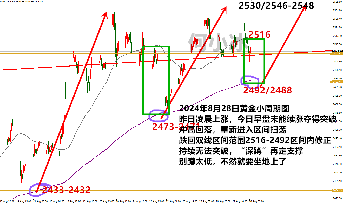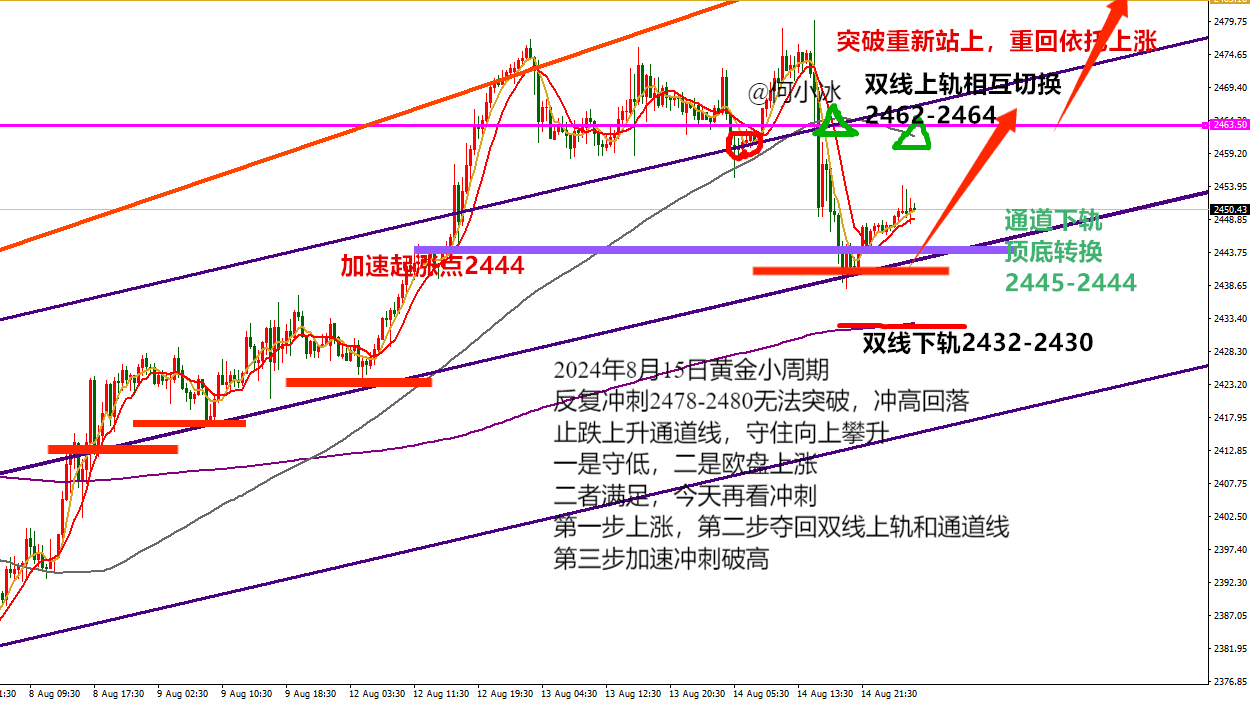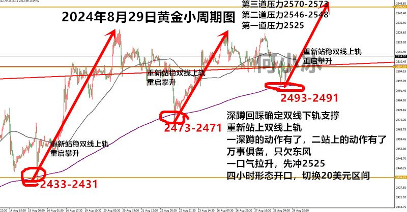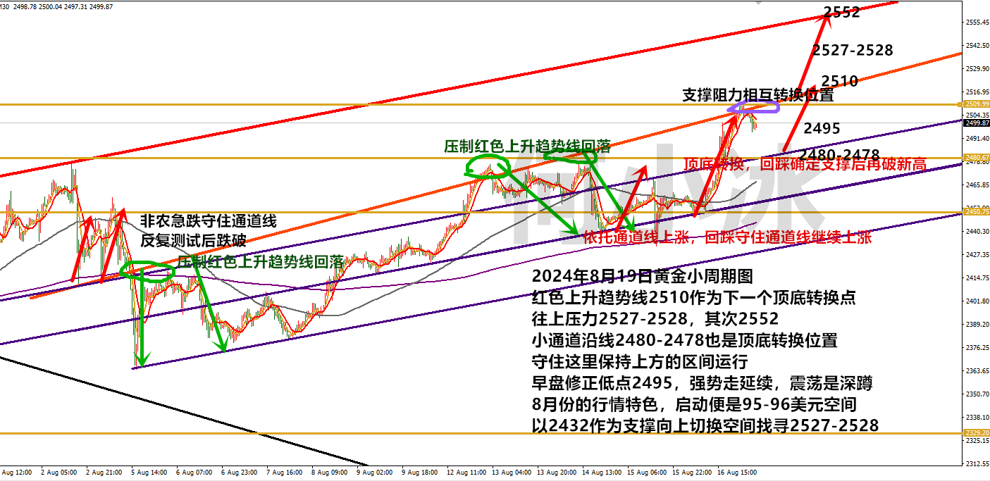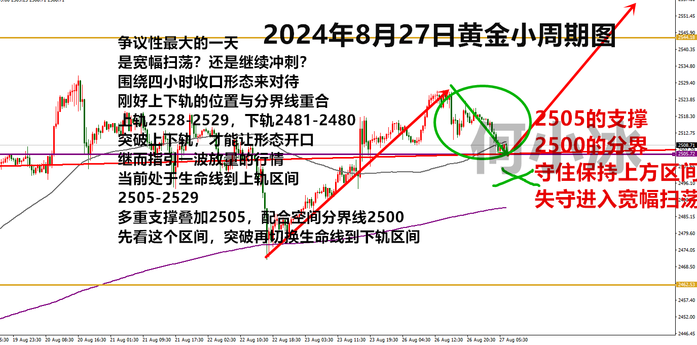 何小冰:在 买涨买跌中试水,站稳2500再重启多头上涨 历史循环再现的关键:在于站上站稳小周期双线上轨和通道沿线位置(2503-2507) 能够实现这一步,昨晚周四的深蹲就是历史重演,循环回踩确定双线下轨的支撑后,重启拉升冲刺,继而往上再冲新高,空间幅度参考90-100美元左右 如若不然, 将进入短期的大区间扫荡模式,当前围绕2500关口上下30美元的区间扫荡,幅度再扩大20美元,便是2450到2550区域,而 刚好2450是这一波上涨的加速起涨点(上周五反复确定此处的支撑,形成上涨冲刺),而2550是非常魔性的红色上升趋势线沿线位置,作为近期的反复压制线。 对于今日周五来说,首要一点,就是