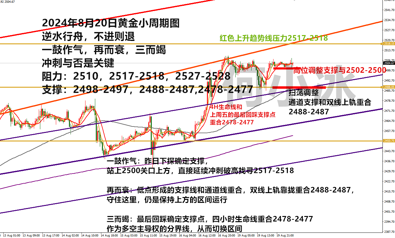 何小冰:黄金2500之上已多,逆水行舟不进则退 今天的行情用两句话来形容: 逆水行舟,不进则退 一鼓作气,再而衰,三而竭 价格持续徘徊在历史新高的位置,昨日先是冲高2507未能直接突破高点走高,反而形成冲高回落的动作,美盘反复确定2485-2486的支撑后,最终形成支撑重新回到2500关口上方 那么,对于今日周二来说 ,昨日周一的空间震荡可以理解为修正,价格重新回到2500关口,一鼓作气,借助直接拉升是最佳的状况, 先不说大涨暴涨,先涨破高点2510 ,然后再去 找红色上升趋势线位置2517-2518区域 随着时间的推移, 现在小周期双线的上轨已经向上靠拢到小通道的沿线位置,叠加重合在248