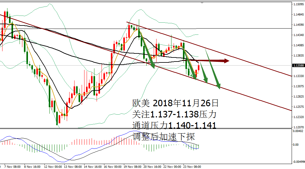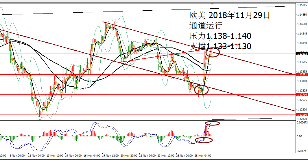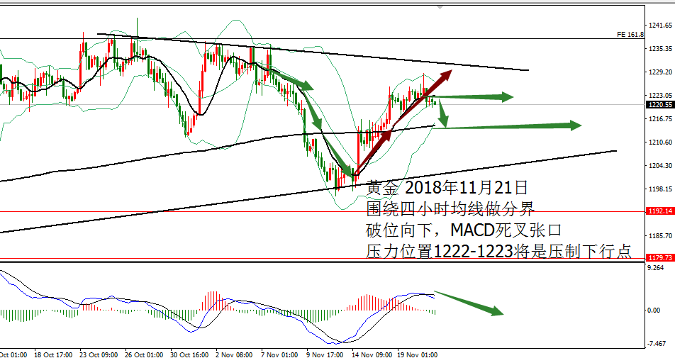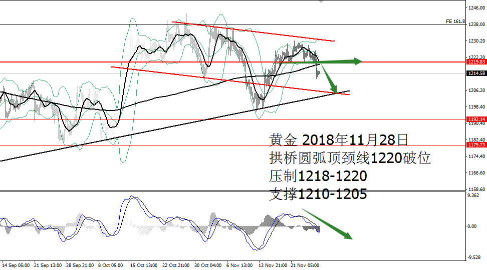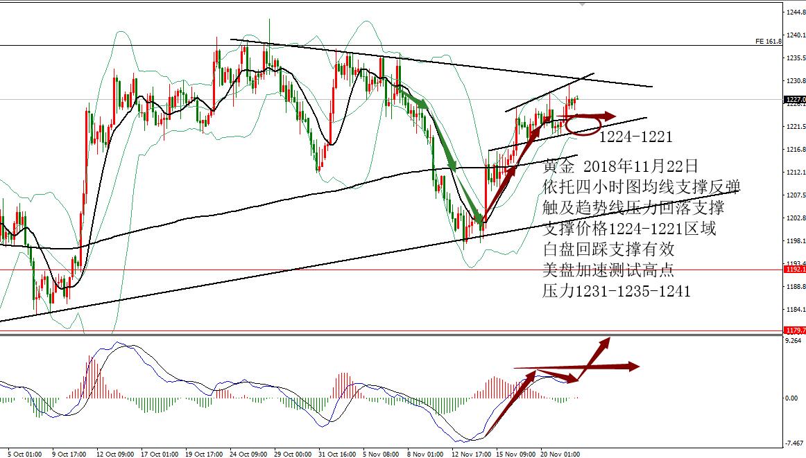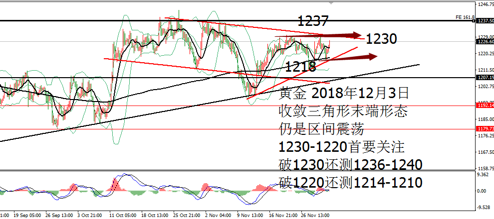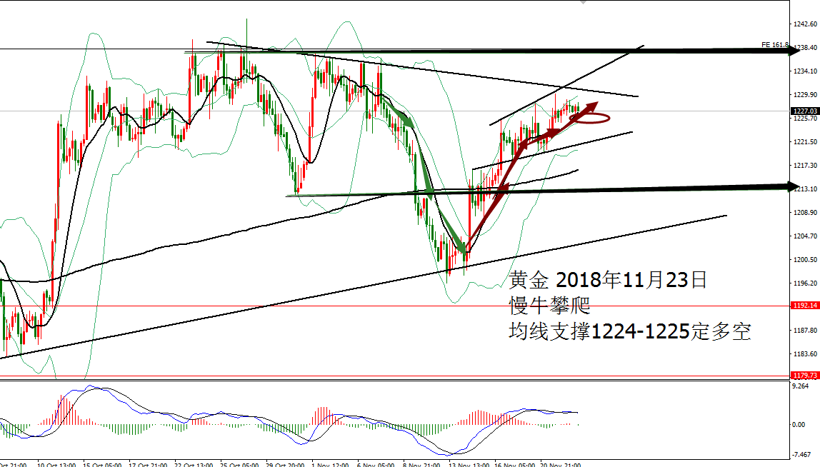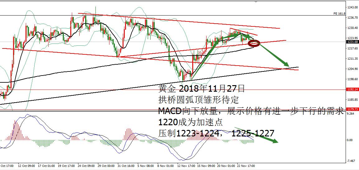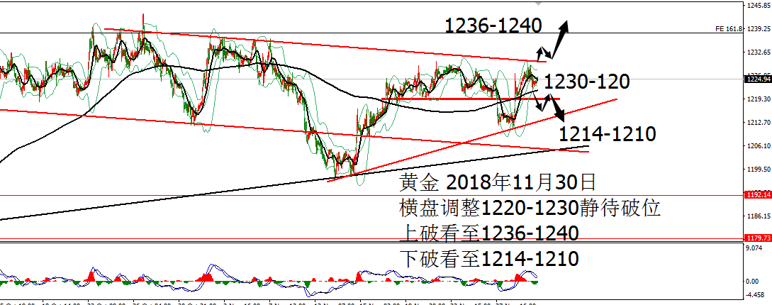 何小冰:黄金拱桥圆弧顶雏形,欧美通道运行 11.27 技术分析: 黄金周一亚盘依托1222支撑震荡反弹,欧盘延续走高测试1228,随后陷入1227-1225区间反复测试调整,美盘过后未有冲高动作,震荡回落,午夜时段横盘再1224-1222结束当天的行情。 围绕四小时布林带横盘震荡。 黄金周线布林带收口区间1241-1183,目前仍是处于年线与MA10区域范围,两者相互靠拢,空间再度收缩为1230-1216,生命线支撑1213-1212,蓄势待发,等待新的方向牵引。 日线没有明显的方向指引,目前的支撑位置在生命线和MA10区域,布林带走平1239-1202,中间生命线作为分界点,破低走重回下轨