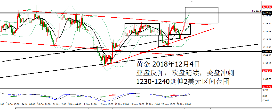 何小冰:黄金慢牛反弹,欧元英镑跌宕起伏 12.04 黄金 周一亚盘开盘依托1220震荡反弹,欧盘加速冲刺破位1230,美盘前站上1230上方位置徘徊,回踩1227-1228后加速冲刺1235,最终仍是收线在1230上方结束当天的行情。 亚盘依托支撑反弹,欧盘延续冲刺,美盘加速冲刺破新高。 周线上轨微微张开至1242压力,年线和10日均线粘合形成支撑叠加在1220-1216,周一开盘直接依托此位置支撑拉升反弹,本周能够收线突破上轨压制,才能算得上是打开区间加速冲刺。 日线依托10日均线拉升冲刺上轨压力,目前正徘徊在此轮下跌斐波扩展1.618及上轨压力区域1238的位置,均线支撑1224-122