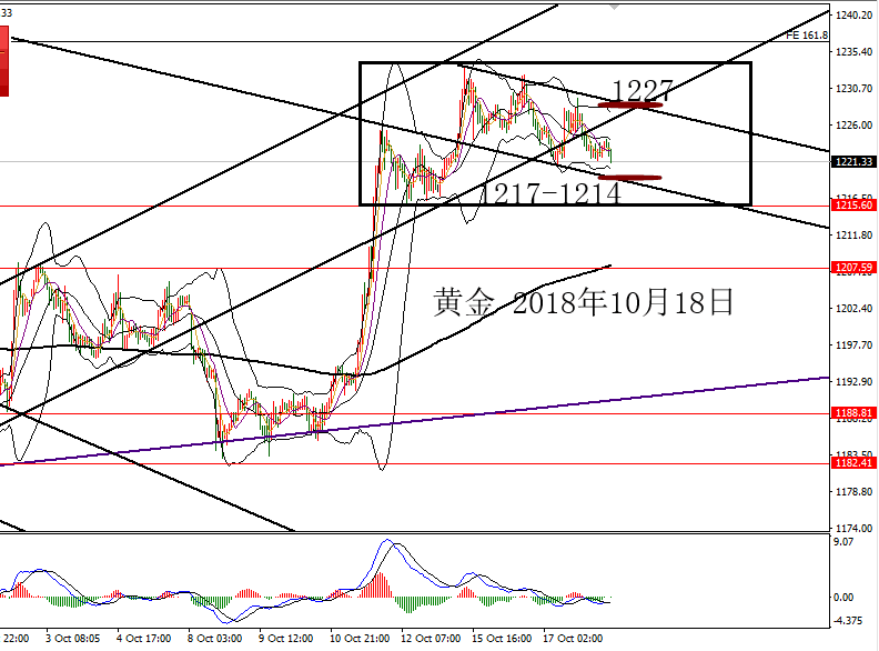 何小冰:欧元英镑原油破区间看延续 10.18 黄金周一亚盘依托1217低点防守震荡走高,欧盘破位上周大阳顶部1226-1227,美盘加速冲刺1233区域,美盘过后并未延续破位,反而冲高1233回落支撑1224,尾盘走区间1224-1233震荡调整。 周二亚盘承压回落回踩支撑1225,午后开始震荡反弹向上,美盘延续冲刺1232,美盘过后并未有延续破位,午夜开始承压回落下探1223区域,尾盘低位横盘震荡,与周一走势相似。 周三亚盘承压回落破低触及1221-1220区域,欧盘反弹拉升破位开盘高点1226,美盘前回踩1225后加速测试1229,美盘过后并未有延续破位,随后开始承压回落,直至午夜后震荡