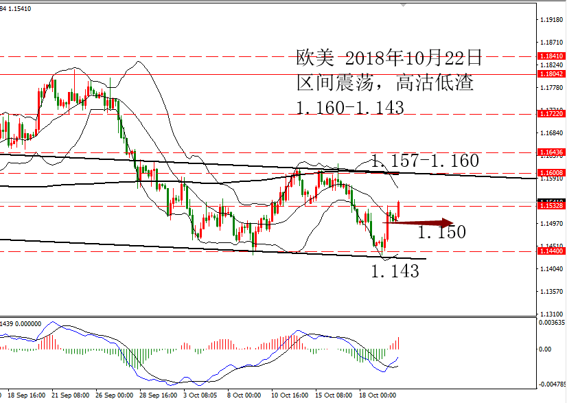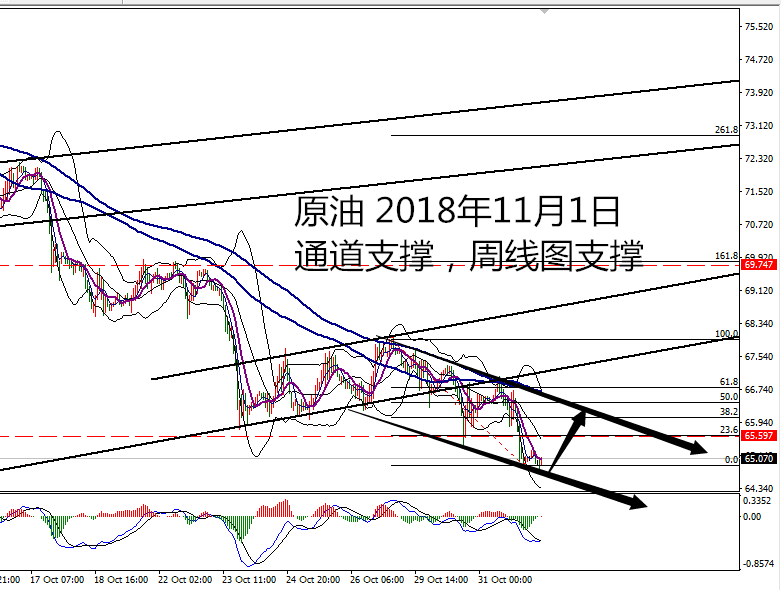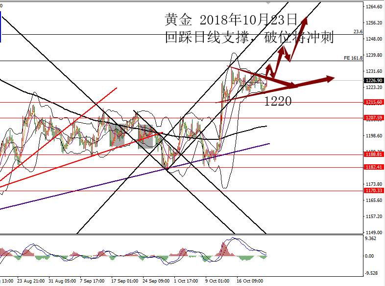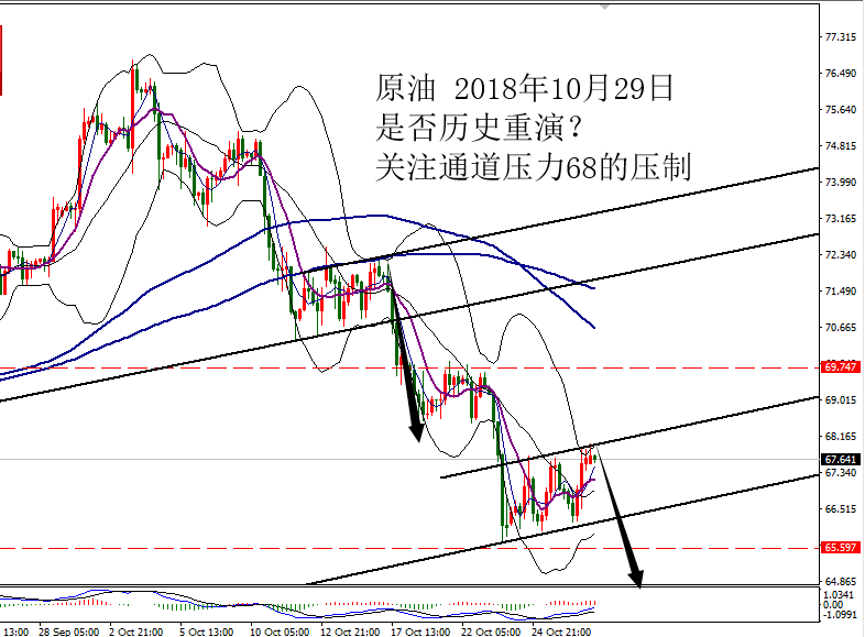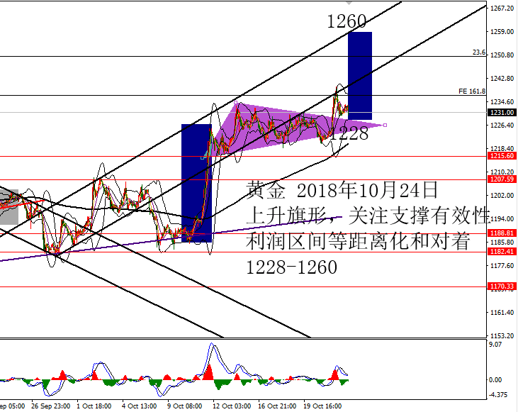 何小冰 黄金1238回撤需求,原油历史重演 10.29 技术分析 上周黄金周一承压回落下探支撑1220关口,随后开始震荡反攻,周二直接大阳拉升破位压制位置1230,触及1240关口。接下来三天由于回撤力度过大,行情陷入区间震荡,不过在周五再度受到避险影响,黄金冲刺破位新高1243,随后大幅回落吞没日内涨势,收盘于1230关口结束周内行情。 黄金周线压力下移至1238-1240,均线支撑上移至1223-1219,周线四连阳,是2018年1月以来最长连阳的周线收线,突破站稳1238-1240才能继续向上高歌,测试布林带上轨压力1265. 日线依托10日均线震荡走高,触及上轨压力承压回落,上周五尾