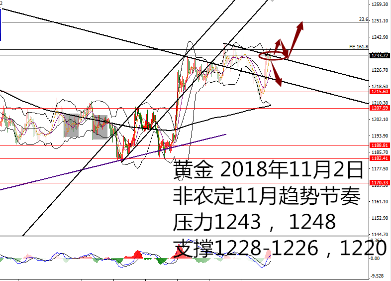 何小冰:非农定11月趋势节奏 11.02 非农解读: 本次非农预计增加19万人,前值为13.4万人,此前公布的美国消费者信息指数创下18年新高,周三ADP就业数据从21.8万上升至22.7万人,而周四美国初请失业金数据平均初请救济人数从20.9万上升至21.3万。近期美国经济数据表现靓丽,助力美元,也有表现一般且差劲的数据,或成为拖后腿的存在。 晚间非农数据若表现靓丽,将助力美元守住关键关口96-95.8大关,若表现不佳,将促使美元直接跌破这个关键的分界口,无论哪种结果,都将影响到11月整个月的行情走势。 技术分析: 本周黄金周一至周三走同样的循环规律,周一承压1236下探至1225,周二承