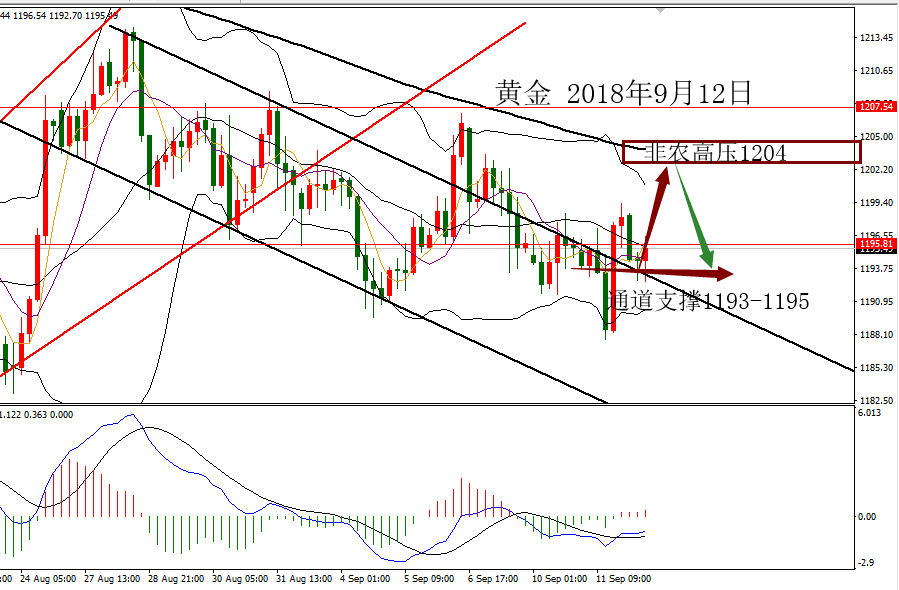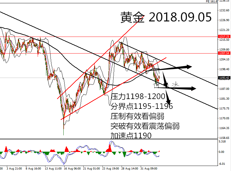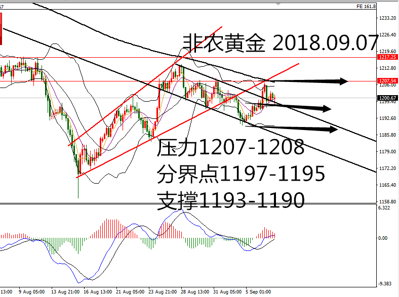 何小冰:非农上线,能否助力打开区间?09.07 今日非农之日,此次非农数据只需要别太糟糕,都能为9月利率决议带来希望。欧元区GDP等多项数据登场,欧元触及关键压力,待命抉择。特朗普遭遇最痛心背叛,或将再度点燃贸易炮火直指多灾多难的日本。瑞典大选将至,黑天鹅是否再现。 技术分析: 非农解读,本次非农前值15.7万,预计增加19.1万人,从周四的ADP小非农可以看到行情数据虽然有所下滑,但是就业市场仍是处于比较强劲的状态,预计本次数据处于中间值的概率更大,行情以区间震荡为主。 黄金昨日破位下降通道冲刺四小时年线压力以及上周反复测试的压力区间1207-1208支撑范围后承压回落,二次回踩1196-