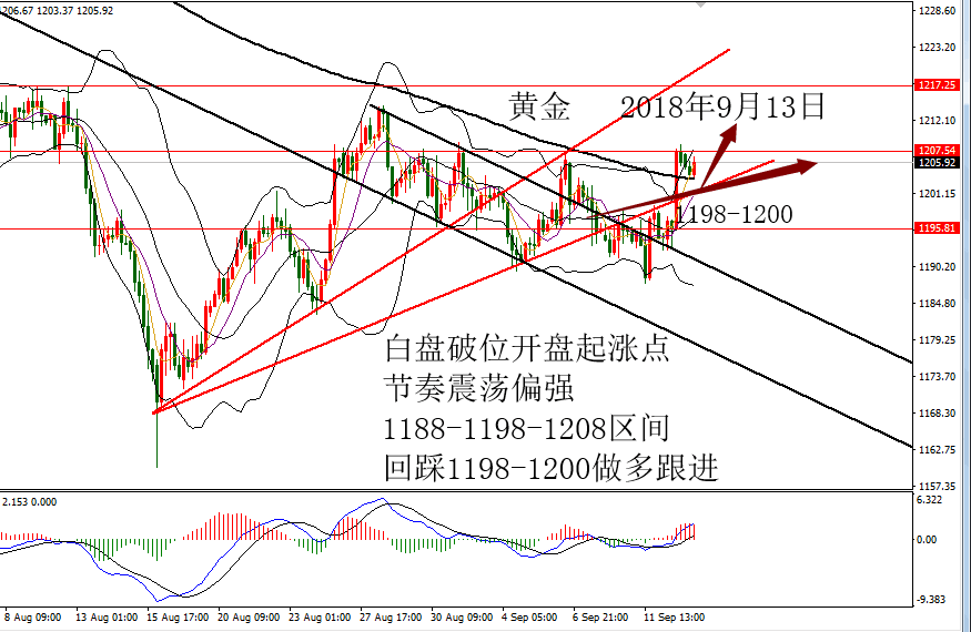 何小冰:黄金非农高低点防守,原油68跟多 09.10 黄金8月中旬加速自1214直接下探至1160跌幅将近54美元,随后出现戏剧性的反转,探底回升自1180拉升至1208涨幅超过28美元,基本收复前一周单边下探的利润,看似已经反转,行情并未有延续,冲高受阻此轮起跌点1214后承压回落,周线再次出现连阴。 周线10日均线压力1196在早间已经完成一次阻力确定,分界点压力1207-1208,日线冲高回落徘徊于生命线位置,MACD靠拢,10日均线压制1198-1200,布林带走平收口1214-1175. 小时图承压在趋势分界四小时年线压力位置,压力下移1207与周线压力叠合。重回下降通道内,通道压